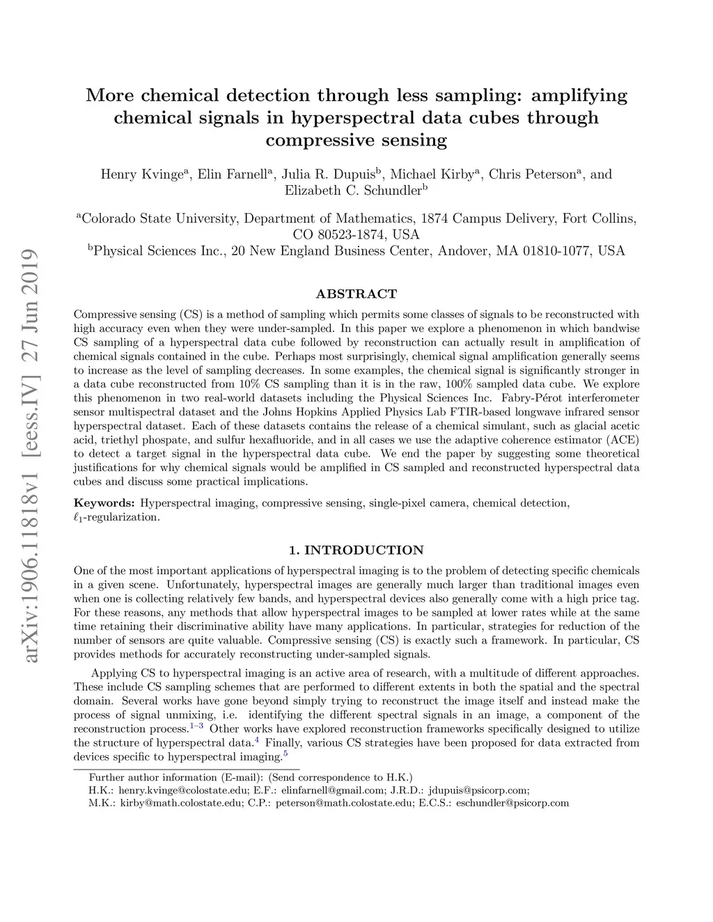 Compressive sensing (CS) is a method of sampling which permits some classes of signals to be reconstructed with high accuracy even when they were under-sampled. In this paper we explore a phenomenon in which bandwise CS sampling of a hyperspectral data cube followed by reconstruction can actually result in amplification of chemical signals contained in the cube. Perhaps most surprisingly, chemical signal amplification generally seems to increase as the level of sampling decreases. In some examples, the chemical signal is significantly stronger in a data cube reconstructed from 10% CS sampling than it is in the raw, 100% sampled data cube. We explore this phenomenon in two real-world datasets including the Physical Sciences Inc. Fabry-P\'{e}rot interferometer sensor multispectral dataset and the Johns Hopkins Applied Physics Lab FTIR-based longwave infrared sensor hyperspectral dataset. Each of these datasets contains the release of a chemical simulant, such as glacial acetic acid, triethyl phospate, and sulfur hexafluoride, and in all cases we use the adaptive coherence estimator (ACE) to detect a target signal in the hyperspectral data cube. We end the paper by suggesting some theoretical justifications for why chemical signals would be amplified in CS sampled and reconstructed hyperspectral data cubes and discuss some practical implications.