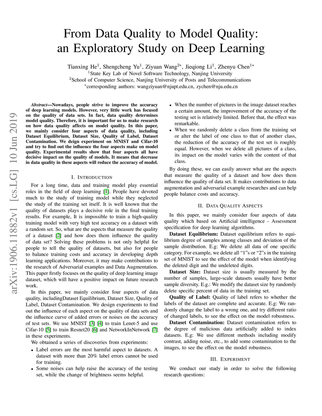 Nowadays, people strive to improve the accuracy of deep learning models. However, very little work has focused on the quality of data sets. In fact, data quality determines model quality. Therefore, it is important for us to make research on how data quality affects on model quality. In this paper, we mainly consider four aspects of data quality, including Dataset Equilibrium, Dataset Size, Quality of Label, Dataset Contamination. We deign experiment on MNIST and Cifar-10 and try to find out the influence the four aspects make on model quality. Experimental results show that four aspects all have decisive impact on the quality of models. It means that decrease in data quality in these aspects will reduce the accuracy of model.