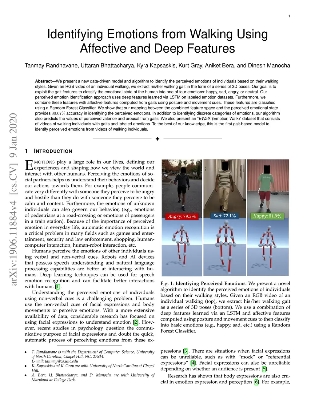 We present a new data-driven model and algorithm to identify the perceived emotions of individuals based on their walking styles. Given an RGB video of an individual walking, we extract his/her walking gait in the form of a series of 3D poses. Our goal is to exploit the gait features to classify the emotional state of the human into one of four emotions: happy, sad, angry, or neutral. Our perceived emotion recognition approach uses deep features learned via LSTM on labeled emotion datasets. Furthermore, we combine these features with affective features computed from gaits using posture and movement cues. These features are classified using a Random Forest Classifier. We show that our mapping between the combined feature space and the perceived emotional state provides 80.07% accuracy in identifying the perceived emotions. In addition to classifying discrete categories of emotions, our algorithm also predicts the values of perceived valence and arousal from gaits. We also present an EWalk (Emotion Walk) dataset that consists of videos of walking individuals with gaits and labeled emotions. To the best of our knowledge, this is the first gait-based model to identify perceived emotions from videos of walking individuals.