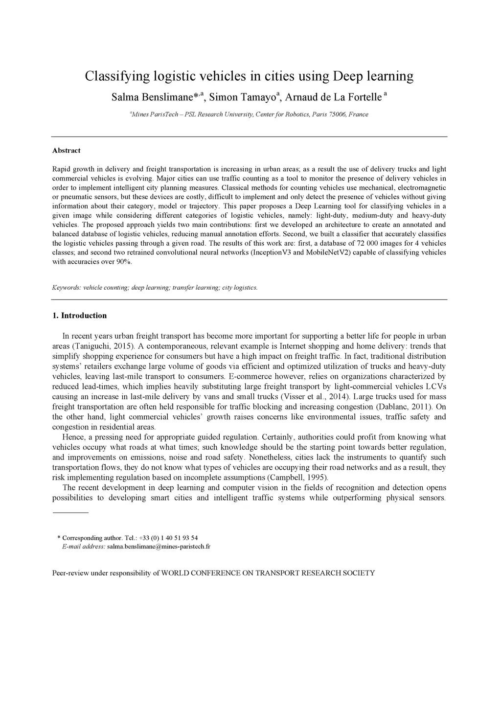 Rapid growth in delivery and freight transportation is increasing in urban areas; as a result the use of delivery trucks and light commercial vehicles is evolving. Major cities can use traffic counting as a tool to monitor the presence of delivery vehicles in order to implement intelligent city planning measures. Classical methods for counting vehicles use mechanical, electromagnetic or pneumatic sensors, but these devices are costly, difficult to implement and only detect the presence of vehicles without giving information about their category, model or trajectory. This paper proposes a Deep Learning tool for classifying vehicles in a given image while considering different categories of logistic vehicles, namely: light-duty, medium-duty and heavy-duty vehicles. The proposed approach yields two main contributions: first we developed an architecture to create an annotated and balanced database of logistic vehicles, reducing manual annotation efforts. Second, we built a classifier that accurately classifies the logistic vehicles passing through a given road. The results of this work are: first, a database of 72 000 images for 4 vehicles classes; and second two retrained convolutional neural networks (InceptionV3 and MobileNetV2) capable of classifying vehicles with accuracies over 90%.