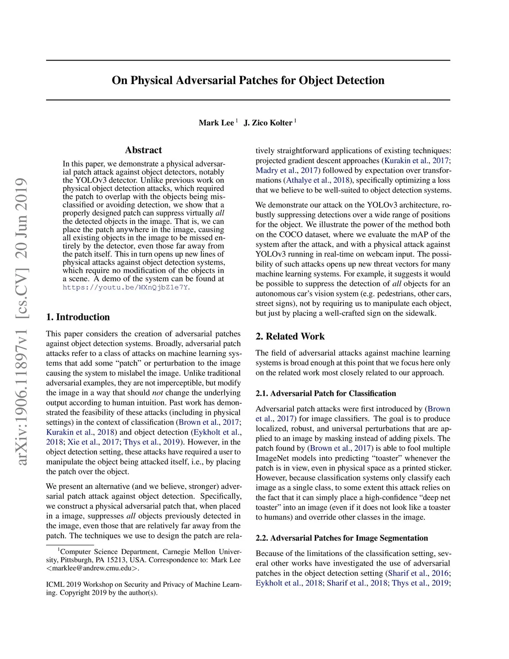 In this paper, we demonstrate a physical adversarial patch attack against object detectors, notably the YOLOv3 detector. Unlike previous work on physical object detection attacks, which required the patch to overlap with the objects being misclassified or avoiding detection, we show that a properly designed patch can suppress virtually all the detected objects in the image. That is, we can place the patch anywhere in the image, causing all existing objects in the image to be missed entirely by the detector, even those far away from the patch itself. This in turn opens up new lines of physical attacks against object detection systems, which require no modification of the objects in a scene. A demo of the system can be found at https://youtu.be/WXnQjbZ1e7Y.