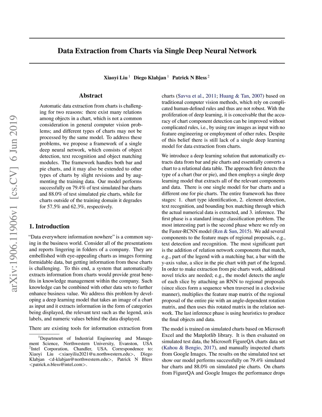 Automatic data extraction from charts is challenging for two reasons: there exist many relations among objects in a chart, which is not a common consideration in general computer vision problems; and different types of charts may not be processed by the same model. To address these problems, we propose a framework of a single deep neural network, which consists of object detection, text recognition and object matching modules. The framework handles both bar and pie charts, and it may also be extended to other types of charts by slight revisions and by augmenting the training data. Our model performs successfully on 79.4% of test simulated bar charts and 88.0% of test simulated pie charts, while for charts outside of the training domain it degrades for 57.5% and 62.3%, respectively.