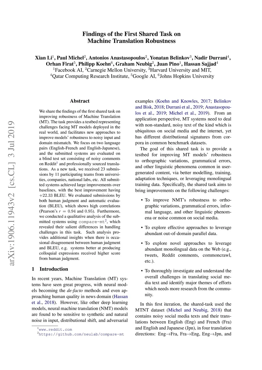 We share the findings of the first shared task on improving robustness of Machine Translation (MT). The task provides a testbed representing challenges facing MT models deployed in the real world, and facilitates new approaches to improve models; robustness to noisy input and domain mismatch. We focus on two language pairs (English-French and English-Japanese), and the submitted systems are evaluated on a blind test set consisting of noisy comments on Reddit and professionally sourced translations. As a new task, we received 23 submissions by 11 participating teams from universities, companies, national labs, etc. All submitted systems achieved large improvements over baselines, with the best improvement having +22.33 BLEU. We evaluated submissions by both human judgment and automatic evaluation (BLEU), which shows high correlations (Pearson's r = 0.94 and 0.95). Furthermore, we conducted a qualitative analysis of the submitted systems using compare-mt, which revealed their salient differences in handling challenges in this task. Such analysis provides additional insights when there is occasional disagreement between human judgment and BLEU, e.g. systems better at producing colloquial expressions received higher score from human judgment.