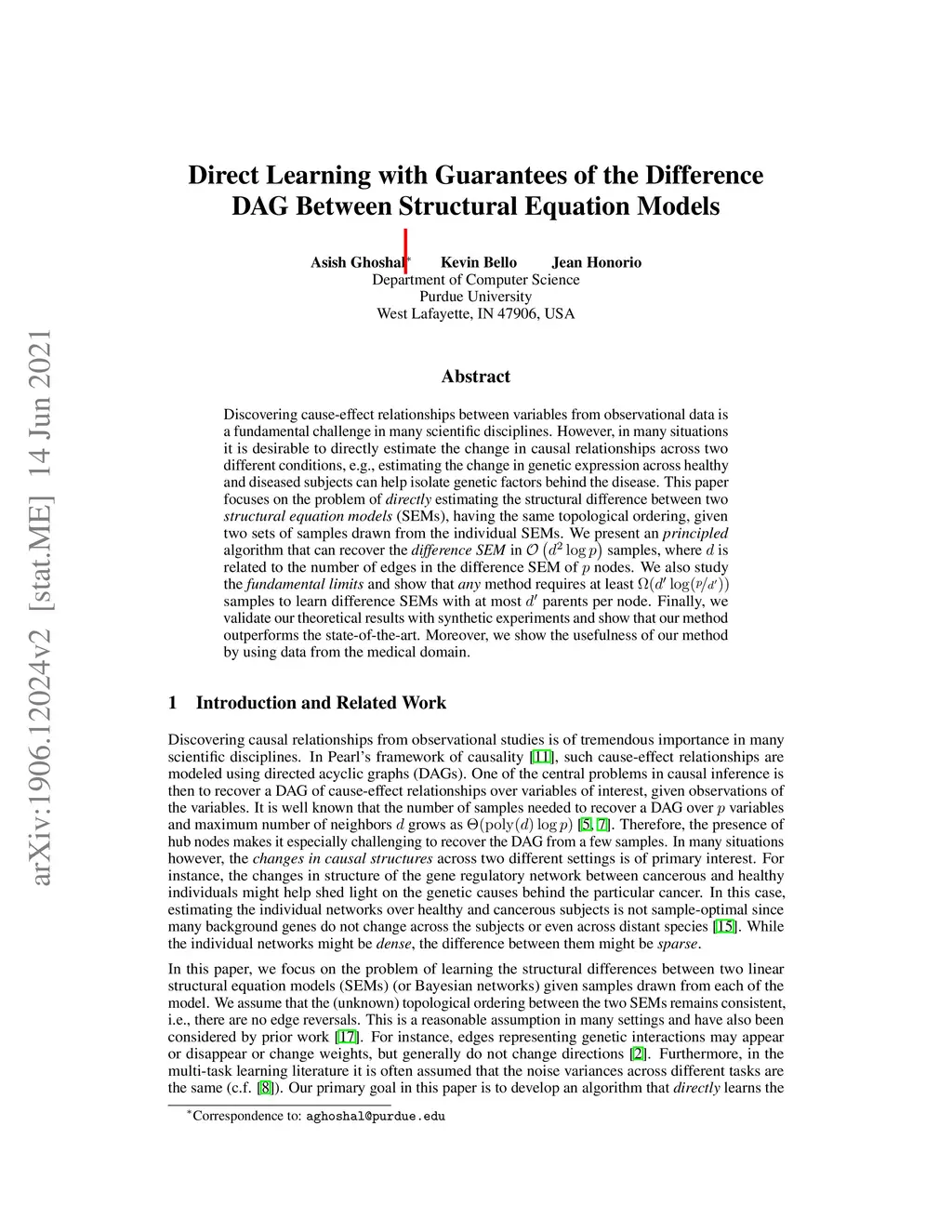 Discovering cause-effect relationships between variables from observational data is a fundamental challenge in many scientific disciplines. However, in many situations it is desirable to directly estimate the change in causal relationships across two different conditions, e.g., estimating the change in genetic expression across healthy and diseased subjects can help isolate genetic factors behind the disease. This paper focuses on the problem of directly estimating the structural difference between two causal DAGs, having the same topological ordering, given two sets of samples drawn from the individual DAGs. We present an algorithm that can recover the difference-DAG in samples, where is related to the number of edges in the difference-DAG. We also show that any method requires at least samples to learn difference DAGs with at most parents per node. We validate our theoretical results with synthetic experiments and show that our method out-performs the state-of-the-art.