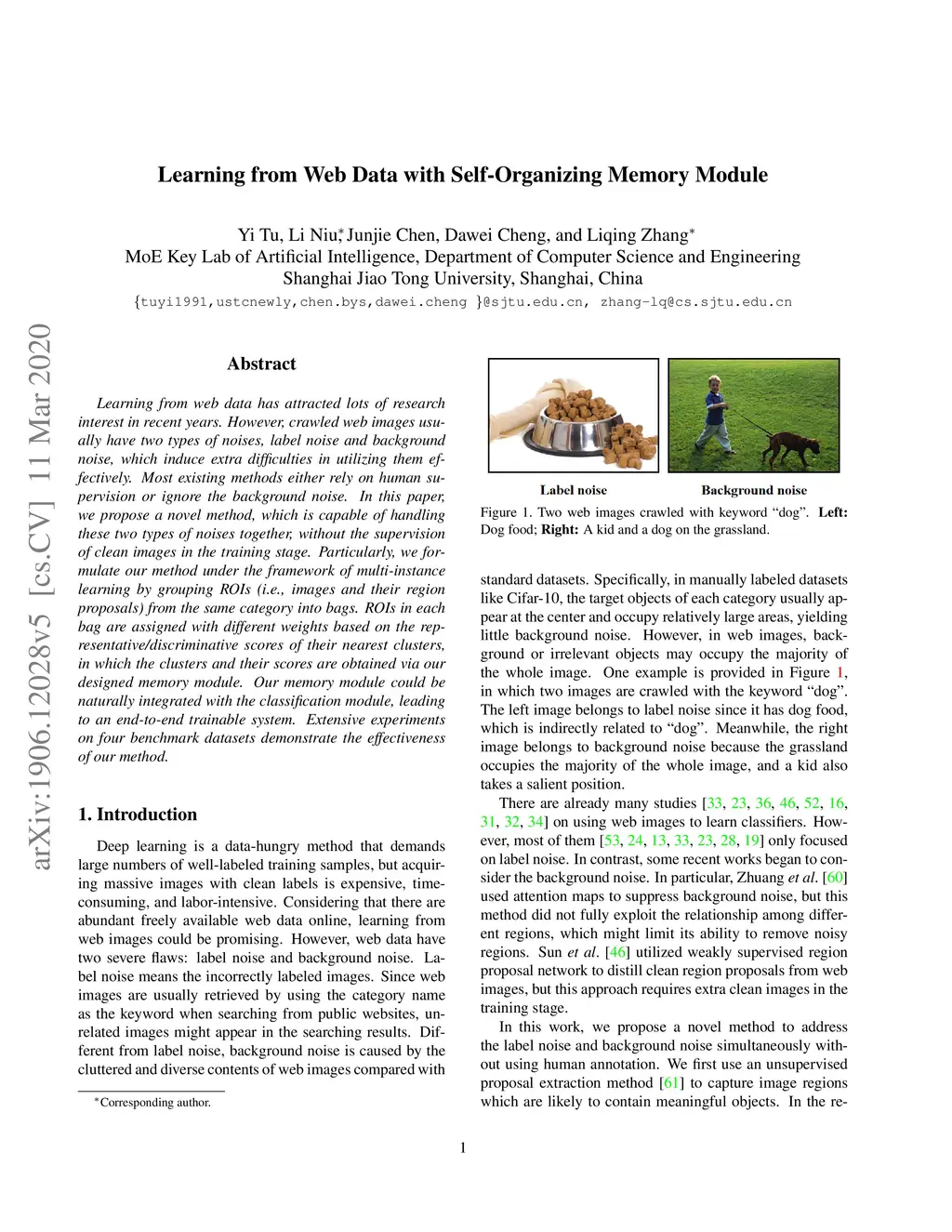 Learning from web data has attracted lots of research interest in recent years. However, crawled web images usually have two types of noises, label noise and background noise, which induce extra difficulties in utilizing them effectively. Most existing methods either rely on human supervision or ignore the background noise. In this paper, we propose a novel method, which is capable of handling these two types of noises together, without the supervision of clean images in the training stage. Particularly, we formulate our method under the framework of multi-instance learning by grouping ROIs (i.e., images and their region proposals) from the same category into bags. ROIs in each bag are assigned with different weights based on the representative/discriminative scores of their nearest clusters, in which the clusters and their scores are obtained via our designed memory module. Our memory module could be naturally integrated with the classification module, leading to an end-to-end trainable system. Extensive experiments on four benchmark datasets demonstrate the effectiveness of our method.