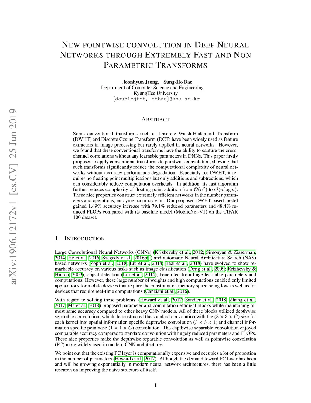 Some conventional transforms such as Discrete Walsh-Hadamard Transform (DWHT) and Discrete Cosine Transform (DCT) have been widely used as feature extractors in image processing but rarely applied in neural networks. However, we found that these conventional transforms have the ability to capture the cross-channel correlations without any learnable parameters in DNNs. This paper firstly proposes to apply conventional transforms to pointwise convolution, showing that such transforms significantly reduce the computational complexity of neural networks without accuracy performance degradation. Especially for DWHT, it requires no floating point multiplications but only additions and subtractions, which can considerably reduce computation overheads. In addition, its fast algorithm further reduces complexity of floating point addition from to . These nice properties construct extremely efficient networks in the number parameters and operations, enjoying accuracy gain. Our proposed DWHT-based model gained 1.49\% accuracy increase with 79.1\% reduced parameters and 48.4\% reduced FLOPs compared with its baseline model (MoblieNet-V1) on the CIFAR 100 dataset.