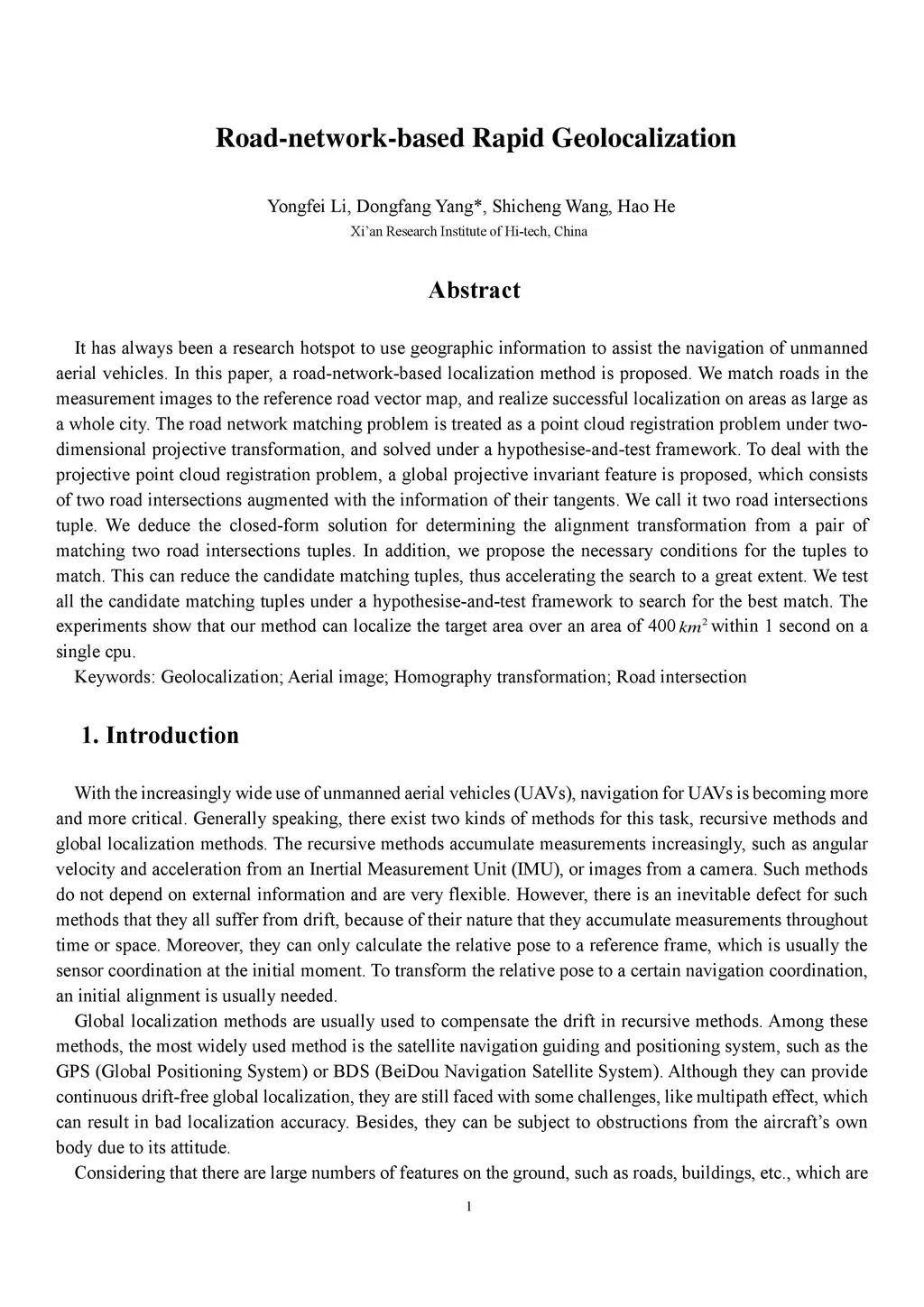 It has always been a research hotspot to use geographic information to assist the navigation of unmanned aerial vehicles. In this paper, a road-network-based localization method is proposed. We match roads in the measurement images to the reference road vector map, and realize successful localization on areas as large as a whole city. The road network matching problem is treated as a point cloud registration problem under two-dimensional projective transformation, and solved under a hypothesise-and-test framework. To deal with the projective point cloud registration problem, a global projective invariant feature is proposed, which consists of two road intersections augmented with the information of their tangents. We call it two road intersections tuple. We deduce the closed-form solution for determining the alignment transformation from a pair of matching two road intersections tuples. In addition, we propose the necessary conditions for the tuples to match. This can reduce the candidate matching tuples, thus accelerating the search to a great extent. We test all the candidate matching tuples under a hypothesise-and-test framework to search for the best match. The experiments show that our method can localize the target area over an area of 400 within 1 second on a single cpu.