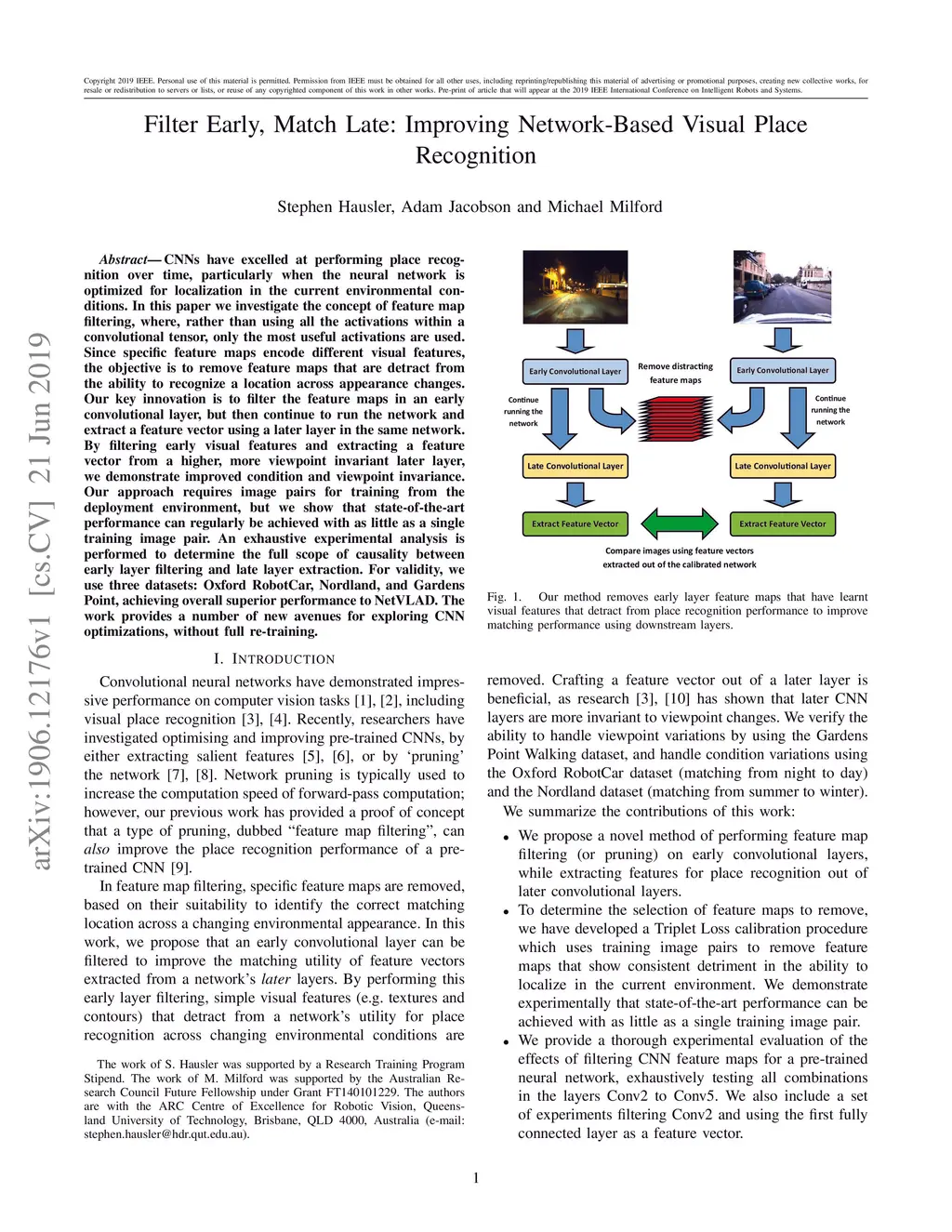 CNNs have excelled at performing place recognition over time, particularly when the neural network is optimized for localization in the current environmental conditions. In this paper we investigate the concept of feature map filtering, where, rather than using all the activations within a convolutional tensor, only the most useful activations are used. Since specific feature maps encode different visual features, the objective is to remove feature maps that are detract from the ability to recognize a location across appearance changes. Our key innovation is to filter the feature maps in an early convolutional layer, but then continue to run the network and extract a feature vector using a later layer in the same network. By filtering early visual features and extracting a feature vector from a higher, more viewpoint invariant later layer, we demonstrate improved condition and viewpoint invariance. Our approach requires image pairs for training from the deployment environment, but we show that state-of-the-art performance can regularly be achieved with as little as a single training image pair. An exhaustive experimental analysis is performed to determine the full scope of causality between early layer filtering and late layer extraction. For validity, we use three datasets: Oxford RobotCar, Nordland, and Gardens Point, achieving overall superior performance to NetVLAD. The work provides a number of new avenues for exploring CNN optimizations, without full re-training.