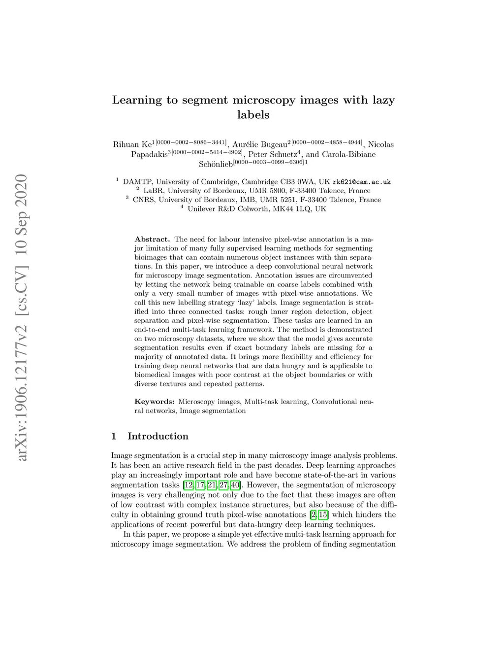 The need for labour intensive pixel-wise annotation is a major limitation of many fully supervised learning methods for segmenting bioimages that can contain numerous object instances with thin separations. In this paper, we introduce a deep convolutional neural network for microscopy image segmentation. Annotation issues are circumvented by letting the network being trainable on coarse labels combined with only a very small number of images with pixel-wise annotations. We call this new labelling strategy `lazy' labels. Image segmentation is stratified into three connected tasks: rough inner region detection, object separation and pixel-wise segmentation. These tasks are learned in an end-to-end multi-task learning framework. The method is demonstrated on two microscopy datasets, where we show that the model gives accurate segmentation results even if exact boundary labels are missing for a majority of annotated data. It brings more flexibility and efficiency for training deep neural networks that are data hungry and is applicable to biomedical images with poor contrast at the object boundaries or with diverse textures and repeated patterns.