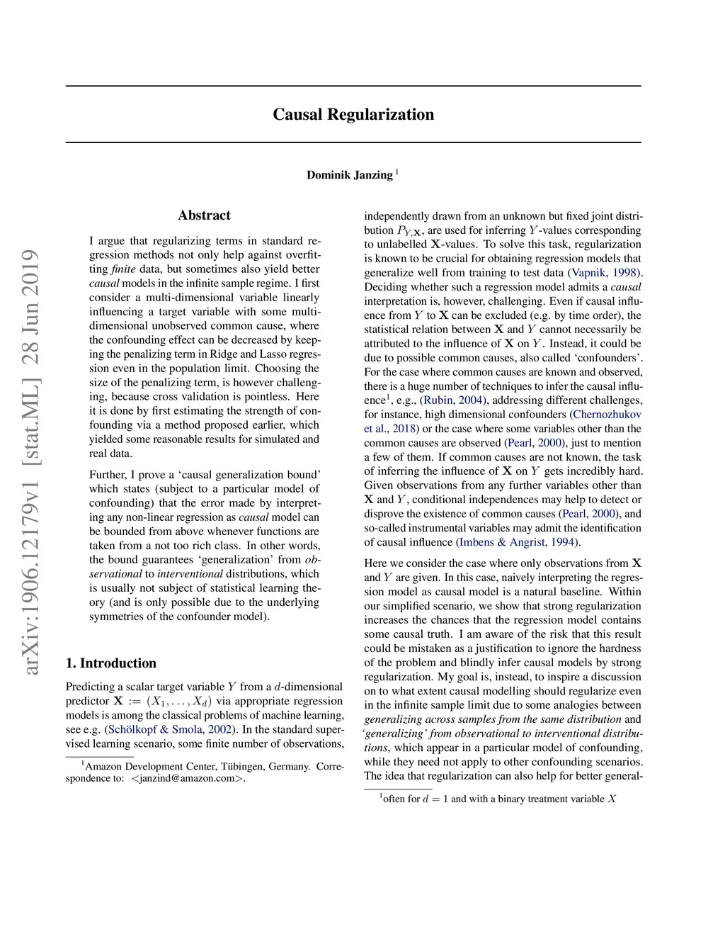 I argue that regularizing terms in standard regression methods not only help against overfitting finite data, but sometimes also yield better causal models in the infinite sample regime. I first consider a multi-dimensional variable linearly influencing a target variable with some multi-dimensional unobserved common cause, where the confounding effect can be decreased by keeping the penalizing term in Ridge and Lasso regression even in the population limit. Choosing the size of the penalizing term, is however challenging, because cross validation is pointless. Here it is done by first estimating the strength of confounding via a method proposed earlier, which yielded some reasonable results for simulated and real data. Further, I prove a `causal generalization bound' which states (subject to a particular model of confounding) that the error made by interpreting any non-linear regression as causal model can be bounded from above whenever functions are taken from a not too rich class. In other words, the bound guarantees "generalization" from observational to interventional distributions, which is usually not subject of statistical learning theory (and is only possible due to the underlying symmetries of the confounder model).