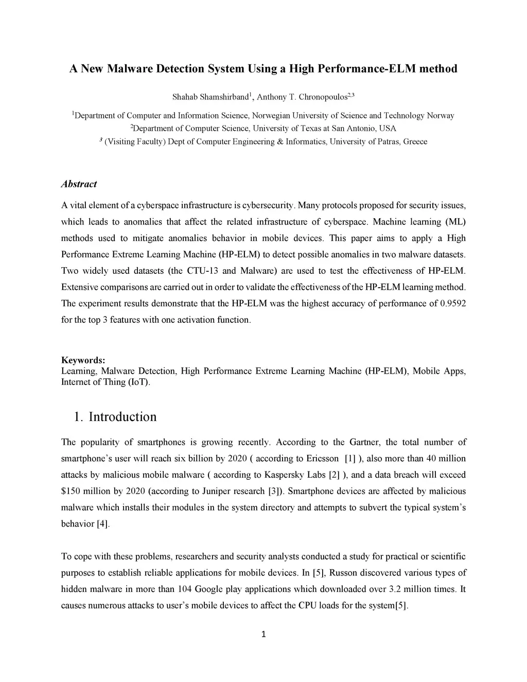 A New Malware Detection System Using a High Performance-ELM method