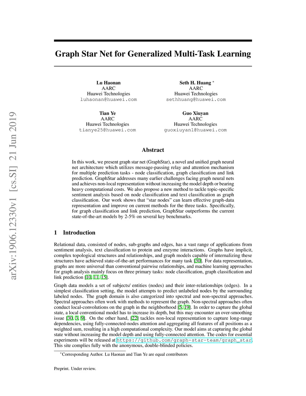 In this work, we present graph star net (GraphStar), a novel and unified graph neural net architecture which utilizes message-passing relay and attention mechanism for multiple prediction tasks - node classification, graph classification and link prediction. GraphStar addresses many earlier challenges facing graph neural nets and achieves non-local representation without increasing the model depth or bearing heavy computational costs. We also propose a new method to tackle topic-specific sentiment analysis based on node classification and text classification as graph classification. Our work shows that 'star nodes' can learn effective graph-data representation and improve on current methods for the three tasks. Specifically, for graph classification and link prediction, GraphStar outperforms the current state-of-the-art models by 2-5% on several key benchmarks.