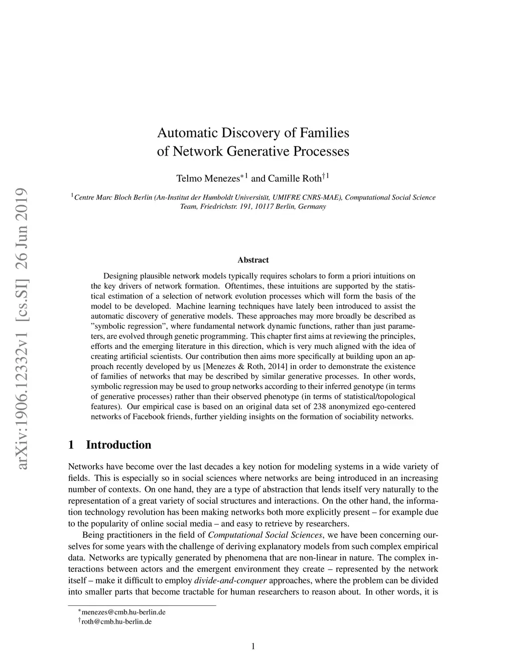 Designing plausible network models typically requires scholars to form a priori intuitions on the key drivers of network formation. Oftentimes, these intuitions are supported by the statistical estimation of a selection of network evolution processes which will form the basis of the model to be developed. Machine learning techniques have lately been introduced to assist the automatic discovery of generative models. These approaches may more broadly be described as "symbolic regression", where fundamental network dynamic functions, rather than just parameters, are evolved through genetic programming. This chapter first aims at reviewing the principles, efforts and the emerging literature in this direction, which is very much aligned with the idea of creating artificial scientists. Our contribution then aims more specifically at building upon an approach recently developed by us [Menezes \& Roth, 2014] in order to demonstrate the existence of families of networks that may be described by similar generative processes. In other words, symbolic regression may be used to group networks according to their inferred genotype (in terms of generative processes) rather than their observed phenotype (in terms of statistical/topological features). Our empirical case is based on an original data set of 238 anonymized ego-centered networks of Facebook friends, further yielding insights on the formation of sociability networks.
