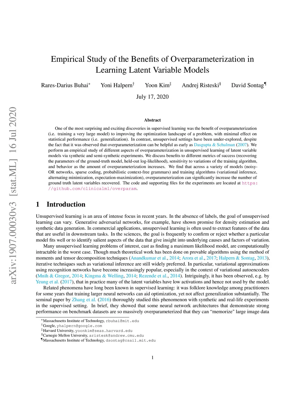 One of the most surprising and exciting discoveries in supervised learning was the benefit of overparameterization (i.e. training a very large model) to improving the optimization landscape of a problem, with minimal effect on statistical performance (i.e. generalization). In contrast, unsupervised settings have been under-explored, despite the fact that it was observed that overparameterization can be helpful as early as Dasgupta & Schulman (2007). We perform an empirical study of different aspects of overparameterization in unsupervised learning of latent variable models via synthetic and semi-synthetic experiments. We discuss benefits to different metrics of success (recovering the parameters of the ground-truth model, held-out log-likelihood), sensitivity to variations of the training algorithm, and behavior as the amount of overparameterization increases. We find that across a variety of models (noisy-OR networks, sparse coding, probabilistic context-free grammars) and training algorithms (variational inference, alternating minimization, expectation-maximization), overparameterization can significantly increase the number of ground truth latent variables recovered.