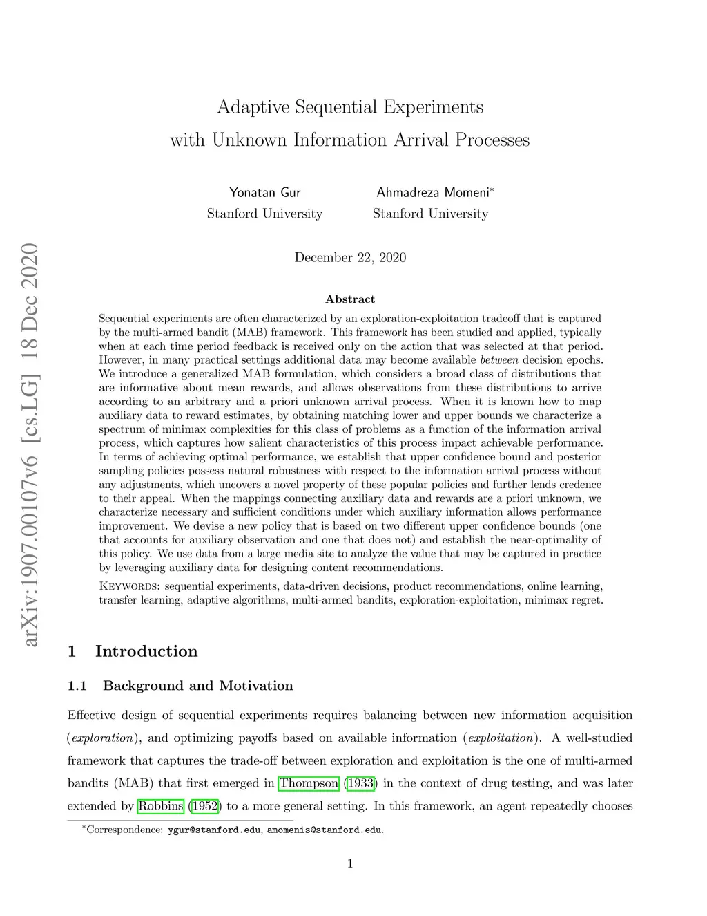 Adaptive Sequential Experiments with Unknown Information Arrival