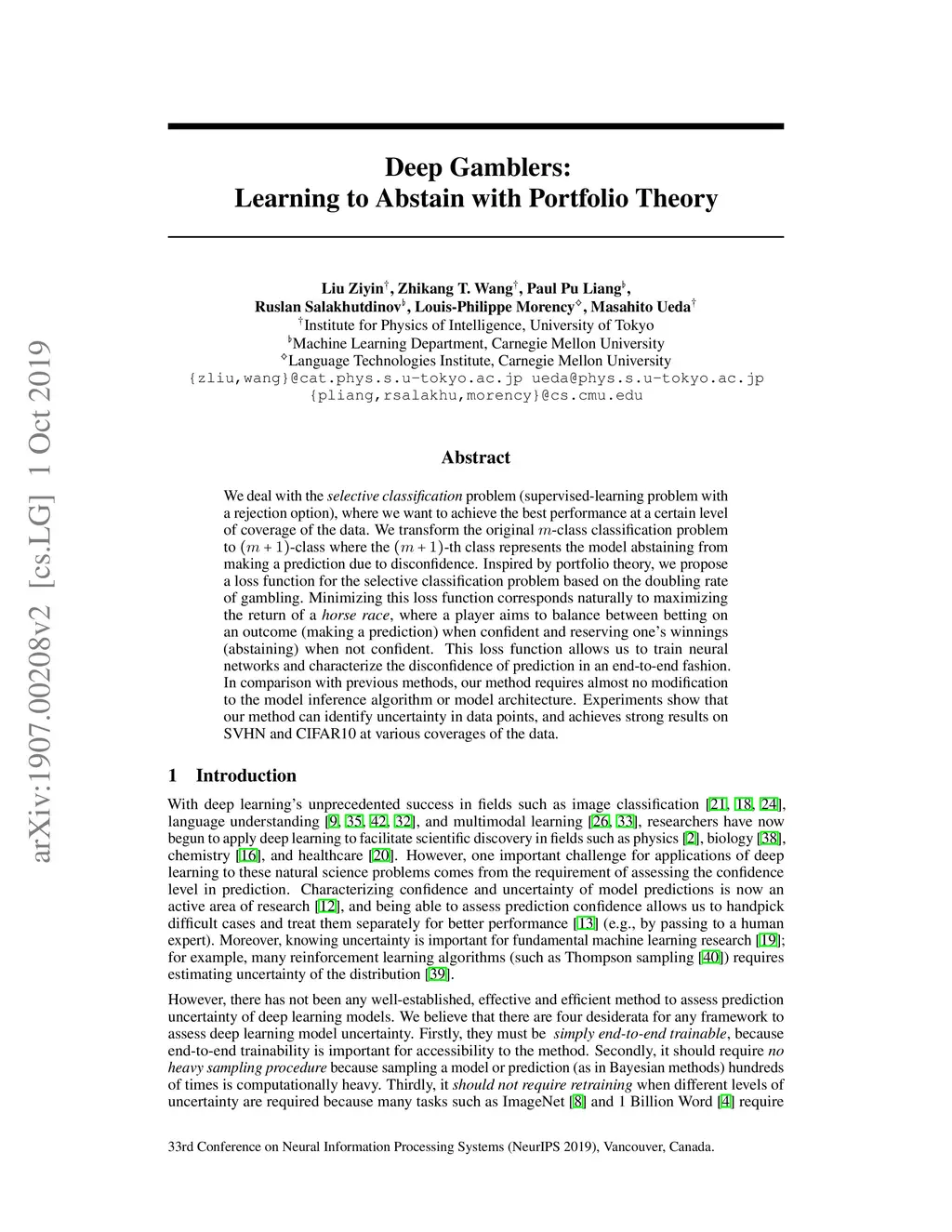 Deep Gamblers: Learning to Abstain with Portfolio Theory