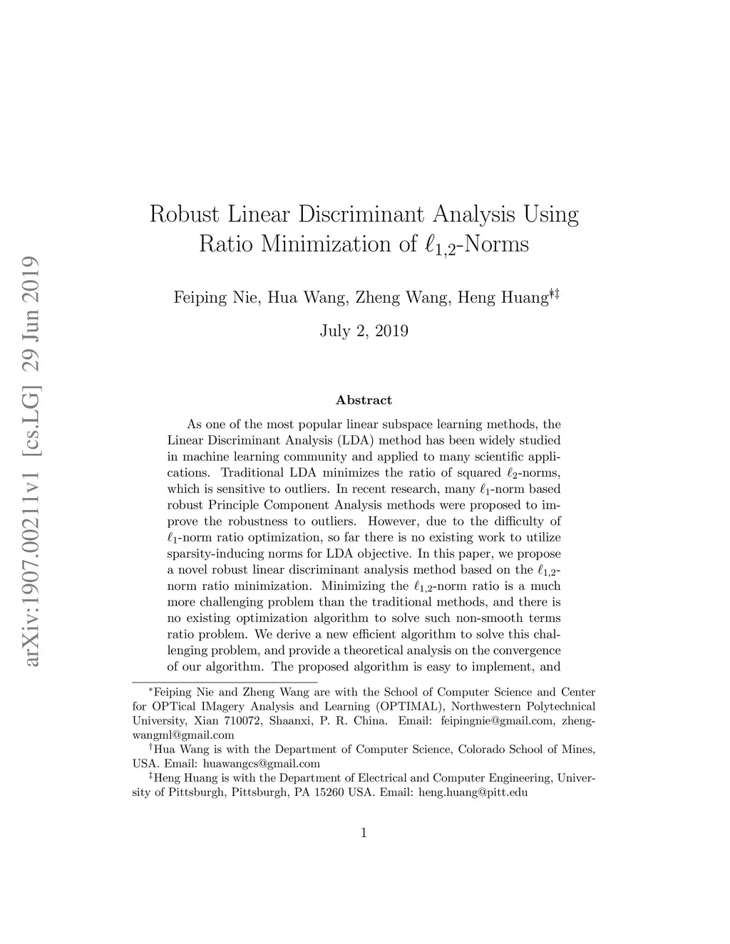 As one of the most popular linear subspace learning methods, the Linear Discriminant Analysis (LDA) method has been widely studied in machine learning community and applied to many scientific applications. Traditional LDA minimizes the ratio of squared L2-norms, which is sensitive to outliers. In recent research, many L1-norm based robust Principle Component Analysis methods were proposed to improve the robustness to outliers. However, due to the difficulty of L1-norm ratio optimization, so far there is no existing work to utilize sparsity-inducing norms for LDA objective. In this paper, we propose a novel robust linear discriminant analysis method based on the L1,2-norm ratio minimization. Minimizing the L1,2-norm ratio is a much more challenging problem than the traditional methods, and there is no existing optimization algorithm to solve such non-smooth terms ratio problem. We derive a new efficient algorithm to solve this challenging problem, and provide a theoretical analysis on the convergence of our algorithm. The proposed algorithm is easy to implement, and converges fast in practice. Extensive experiments on both synthetic data and nine real benchmark data sets show the effectiveness of the proposed robust LDA method.