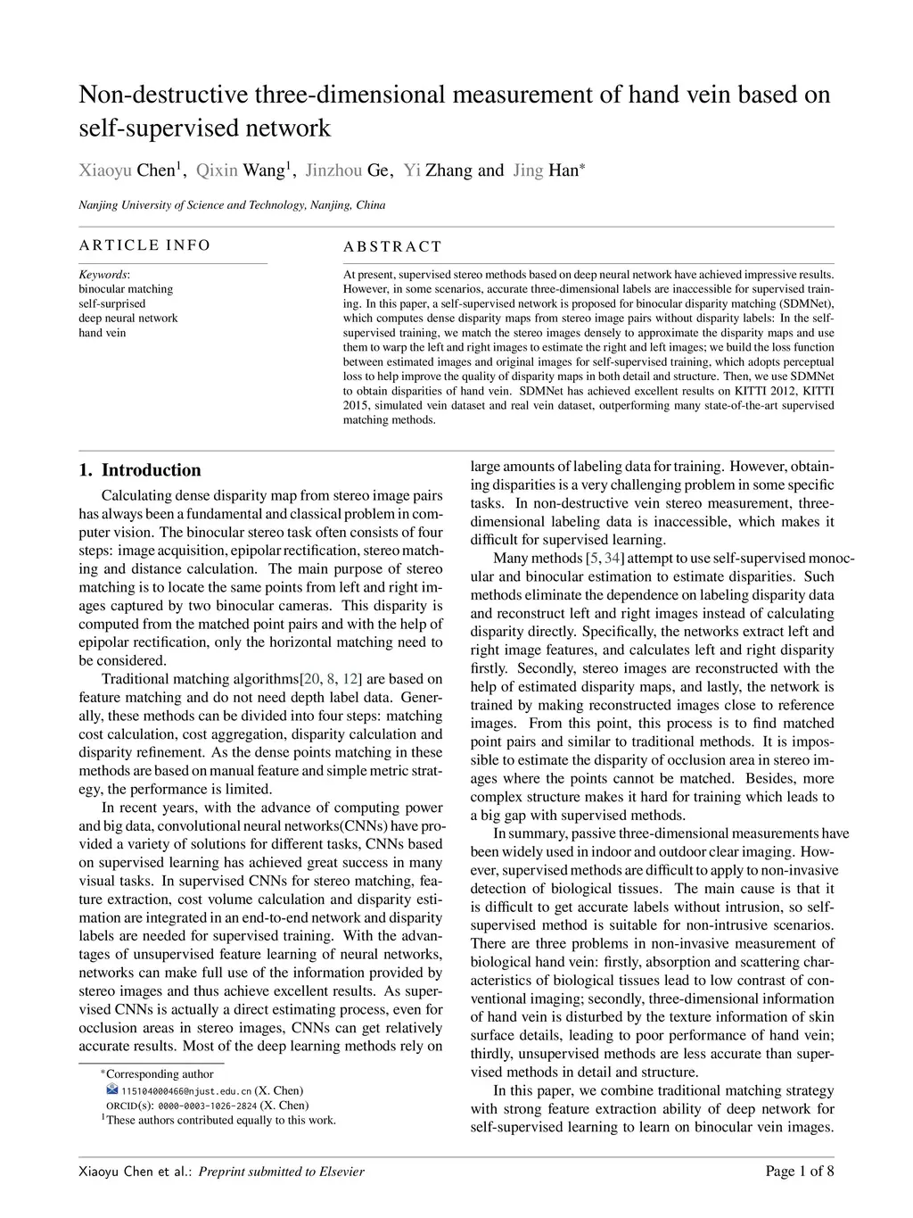 At present, supervised stereo methods based on deep neural network have achieved impressive results. However, in some scenarios, accurate three-dimensional labels are inaccessible for supervised training. In this paper, a self-supervised network is proposed for binocular disparity matching (SDMNet), which computes dense disparity maps from stereo image pairs without disparity labels: In the self-supervised training, we match the stereo images densely to approximate the disparity maps and use them to warp the left and right images to estimate the right and left images; we build the loss function between estimated images and original images for self-supervised training, which adopts perceptual loss to help improve the quality of disparity maps in both detail and structure. Then, we use SDMNet to obtain disparities of hand vein. SDMNet has achieved excellent results on KITTI 2012, KITTI 2015, simulated vein dataset and real vein dataset, outperforming many state-of-the-art supervised matching methods.