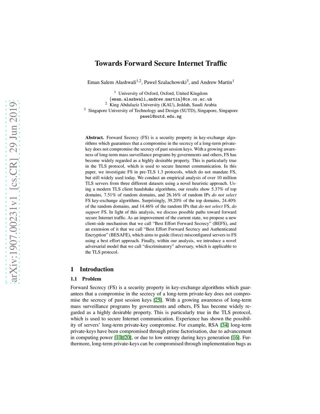 Forward Secrecy (FS) is a security property in key-exchange algorithms which guarantees that a compromise in the secrecy of a long-term private-key does not compromise the secrecy of past session keys. With a growing awareness of long-term mass surveillance programs by governments and others, FS has become widely regarded as a highly desirable property. This is particularly true in the TLS protocol, which is used to secure Internet communication. In this paper, we investigate FS in pre-TLS 1.3 protocols, which do not mandate FS, but still widely used today. We conduct an empirical analysis of over 10 million TLS servers from three different datasets using a novel heuristic approach. Using a modern TLS client handshake algorithms, our results show 5.37% of top domains, 7.51% of random domains, and 26.16% of random IPs do not select FS key-exchange algorithms. Surprisingly, 39.20% of the top domains, 24.40% of the random domains, and 14.46% of the random IPs that do not select FS, do support FS. In light of this analysis, we discuss possible paths toward forward secure Internet traffic. As an improvement of the current state, we propose a new client-side mechanism that we call "Best Effort Forward Secrecy" (BEFS), and an extension of it that we call "Best Effort Forward Secrecy and Authenticated Encryption" (BESAFE), which aims to guide (force) misconfigured servers to FS using a best effort approach. Finally, within our analysis, we introduce a novel adversarial model that we call "discriminatory" adversary, which is applicable to the TLS protocol.