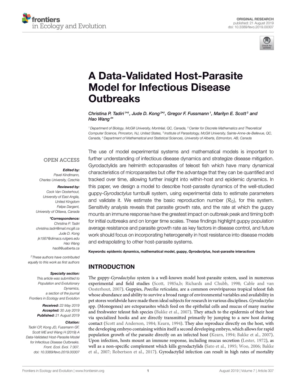 The use of model experimental systems and mathematical models is important to further understanding of infectious disease dynamics and strategize disease mitigation. Gyrodactylids are helminth ectoparasites of teleost fish which have many dynamical characteristics of microparasites but offer the advantage that they can be quantified and tracked over time, allowing further insight into within-host and epidemic dynamics. In this paper, we design a model to describe host-parasite dynamics of the well-studied guppy-Gyrodactylus turnbulli system, using experimental data to estimate parameters and validate it. We estimate the basic reproduction number (R_0), for this system. Sensitivity analysis reveals that parasite growth rate, and the rate at which the guppy mounts an immune response have the greatest impact on outbreak peak and timing both for initial outbreaks and on longer time scales. These findings highlight guppy population resistance and parasite virulence as key factors in disease control, and future work should focus on incorporating heterogeneity in host resistance into disease models and extrapolating to other host-parasite systems.