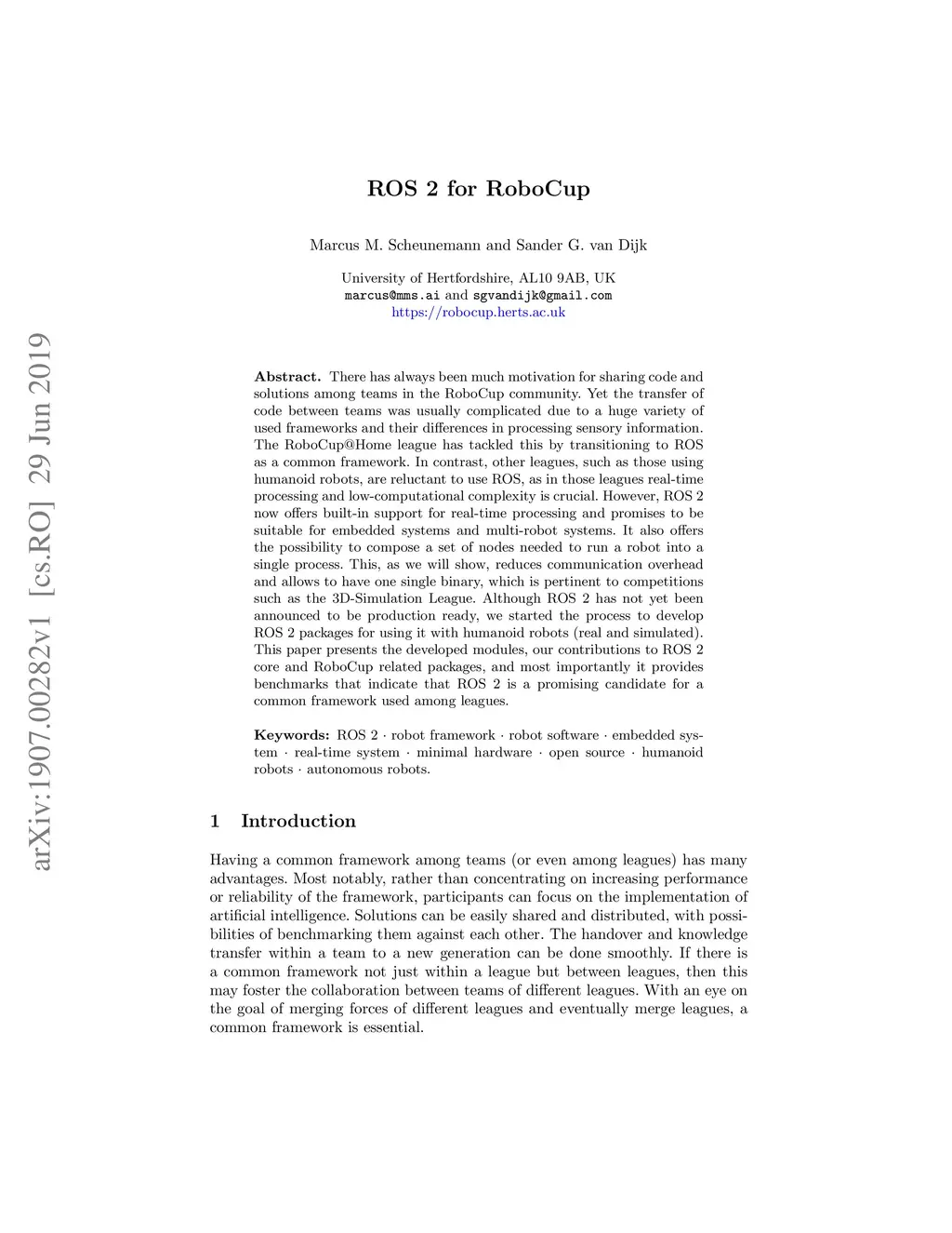 There has always been much motivation for sharing code and solutions among teams in the RoboCup community. Yet the transfer of code between teams was usually complicated due to a huge variety of used frameworks and their differences in processing sensory information. The RoboCup@Home league has tackled this by transitioning to ROS as a common framework. In contrast, other leagues, such as those using humanoid robots, are reluctant to use ROS, as in those leagues real-time processing and low-computational complexity is crucial. However, ROS 2 now offers built-in support for real-time processing and promises to be suitable for embedded systems and multi-robot systems. It also offers the possibility to compose a set of nodes needed to run a robot into a single process. This, as we will show, reduces communication overhead and allows to have one single binary, which is pertinent to competitions such as the 3D-Simulation League. Although ROS 2 has not yet been announced to be production ready, we started the process to develop ROS 2 packages for using it with humanoid robots (real and simulated). This paper presents the developed modules, our contributions to ROS 2 core and RoboCup related packages, and most importantly it provides benchmarks that indicate that ROS 2 is a promising candidate for a common framework used among leagues.
