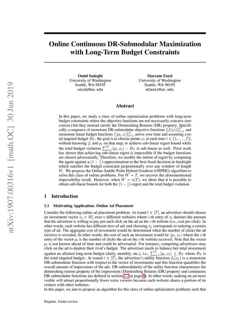 In this paper, we study a class of online optimization problems with long-term budget constraints where the objective functions are not necessarily concave (nor convex) but they instead satisfy the Diminishing Returns (DR) property. Specifically, a sequence of monotone DR-submodular objective functions and monotone linear budget functions arrive over time and assuming a total targeted budget , the goal is to choose points at each time , without knowing and on that step, to achieve sub-linear regret bound while the total budget violation is sub-linear as well. Prior work has shown that achieving sub-linear regret is impossible if the budget functions are chosen adversarially. Therefore, we modify the notion of regret by comparing the agent against a -approximation to the best fixed decision in hindsight which satisfies the budget constraint proportionally over any window of length . We propose the Online Saddle Point Hybrid Gradient (OSPHG) algorithm to solve this class of online problems. For , we recover the aforementioned impossibility result. However, when , we show that it is possible to obtain sub-linear bounds for both the -regret and the total budget violation.