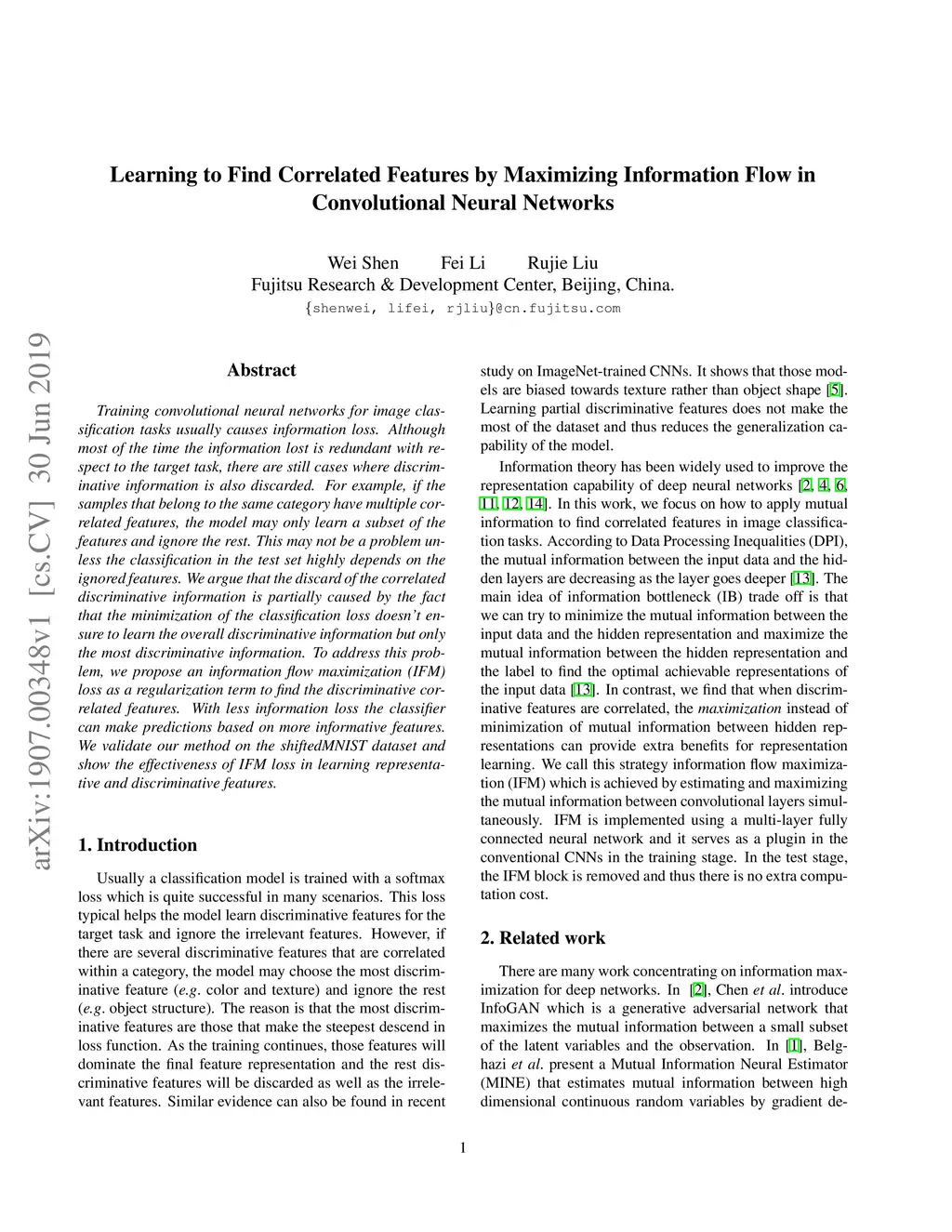 Training convolutional neural networks for image classification tasks usually causes information loss. Although most of the time the information lost is redundant with respect to the target task, there are still cases where discriminative information is also discarded. For example, if the samples that belong to the same category have multiple correlated features, the model may only learn a subset of the features and ignore the rest. This may not be a problem unless the classification in the test set highly depends on the ignored features. We argue that the discard of the correlated discriminative information is partially caused by the fact that the minimization of the classification loss doesn't ensure to learn the overall discriminative information but only the most discriminative information. To address this problem, we propose an information flow maximization (IFM) loss as a regularization term to find the discriminative correlated features. With less information loss the classifier can make predictions based on more informative features. We validate our method on the shiftedMNIST dataset and show the effectiveness of IFM loss in learning representative and discriminative features.
