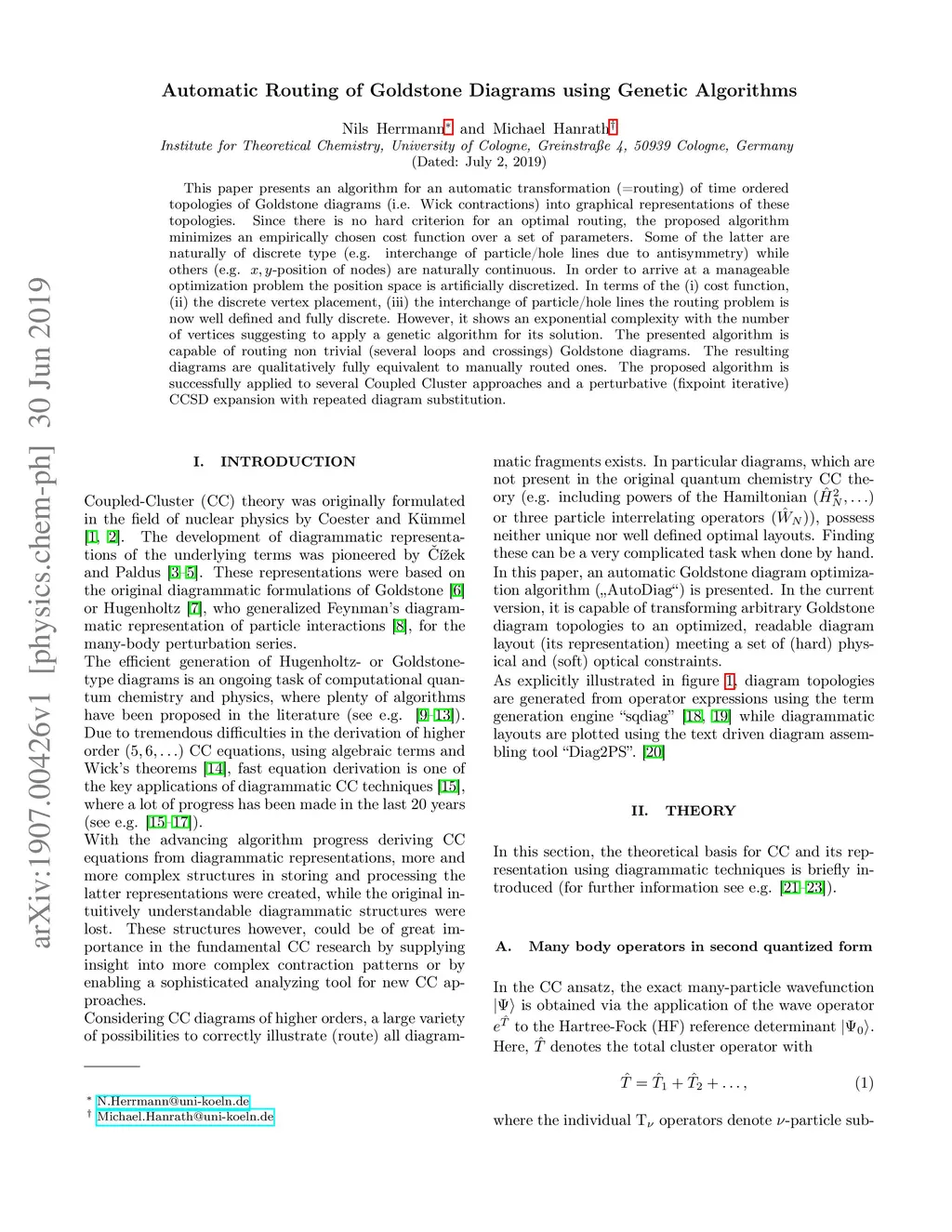 This paper presents an algorithm for an automatic transformation (=routing) of time ordered topologies of Goldstone diagrams (i.e. Wick contractions) into graphical representations of these topologies. Since there is no hard criterion for an optimal routing, the proposed algorithm minimizes an empirically chosen cost function over a set of parameters. Some of the latter are naturally of discrete type (e.g. interchange of particle/hole lines due to antisymmetry) while others (e.g. x,y-position of nodes) are naturally continuous. In order to arrive at a manageable optimization problem the position space is artificially discretized. In terms of the (i) cost function, (ii) the discrete vertex placement, (iii) the interchange of particle/hole lines the routing problem is now well defined and fully discrete. However, it shows an exponential complexity with the number of vertices suggesting to apply a genetic algorithm for its solution. The presented algorithm is capable of routing non trivial (several loops and crossings) Goldstone diagrams. The resulting diagrams are qualitatively fully equivalent to manually routed ones. The proposed algorithm is successfully applied to several Coupled Cluster approaches and a perturbative (fixpoint iterative) CCSD expansion with repeated diagram substitution.