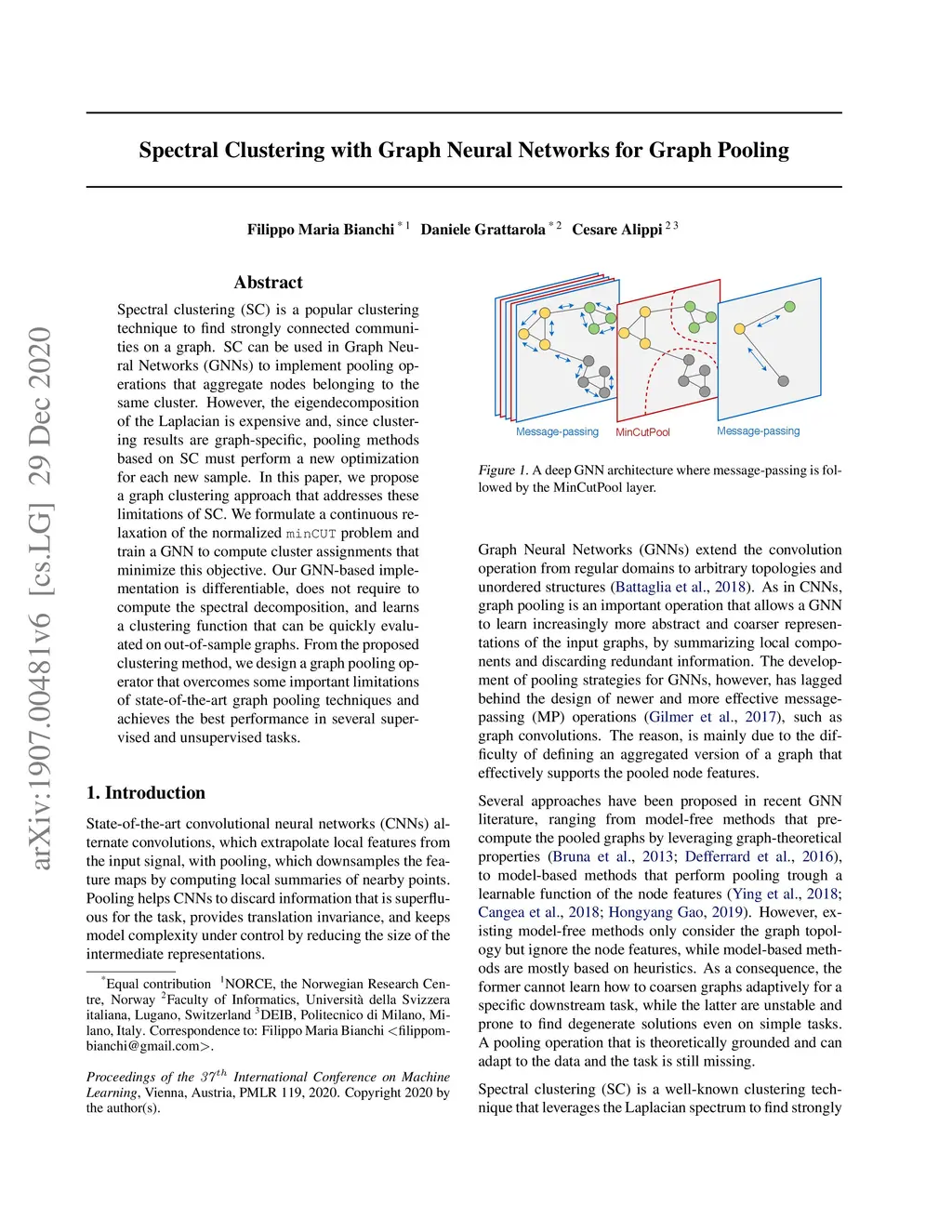 Spectral clustering (SC) is a popular clustering technique to find strongly connected communities on a graph. SC can be used in Graph Neural Networks (GNNs) to implement pooling operations that aggregate nodes belonging to the same cluster. However, the eigendecomposition of the Laplacian is expensive and, since clustering results are graph-specific, pooling methods based on SC must perform a new optimization for each new sample. In this paper, we propose a graph clustering approach that addresses these limitations of SC. We formulate a continuous relaxation of the normalized minCUT problem and train a GNN to compute cluster assignments that minimize this objective. Our GNN-based implementation is differentiable, does not require to compute the spectral decomposition, and learns a clustering function that can be quickly evaluated on out-of-sample graphs. From the proposed clustering method, we design a graph pooling operator that overcomes some important limitations of state-of-the-art graph pooling techniques and achieves the best performance in several supervised and unsupervised tasks.