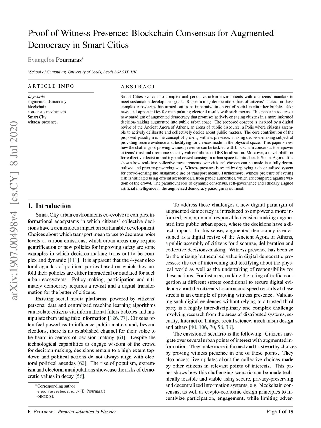 Smart Cities evolve into complex and pervasive urban environments with a citizens' mandate to meet sustainable development goals. Repositioning democratic values of citizens' choices in these complex ecosystems has turned out to be imperative in an era of social media filter bubbles, fake news and opportunities for manipulating electoral results with such means. This paper introduces a new paradigm of augmented democracy that promises actively engaging citizens in a more informed decision-making augmented into public urban space. The proposed concept is inspired by a digital revive of the Ancient Agora of Athens, an arena of public discourse, a Polis where citizens assemble to actively deliberate and collectively decide about public matters. The core contribution of the proposed paradigm is the concept of proving witness presence: making decision-making subject of providing secure evidence and testifying for choices made in the physical space. This paper shows how the challenge of proving witness presence can be tackled with blockchain consensus to empower citizens' trust and overcome security vulnerabilities of GPS localization. Moreover, a novel platform for collective decision-making and crowd-sensing in urban space is introduced: Smart Agora. It is shown how real-time collective measurements over citizens' choices can be made in a fully decentralized and privacy-preserving way. Witness presence is tested by deploying a decentralized system for crowd-sensing the sustainable use of transport means. Furthermore, witness presence of cycling risk is validated using official accident data from public authorities, which are compared against wisdom of the crowd. The paramount role of dynamic consensus, self-governance and ethically aligned artificial intelligence in the augmented democracy paradigm is outlined.