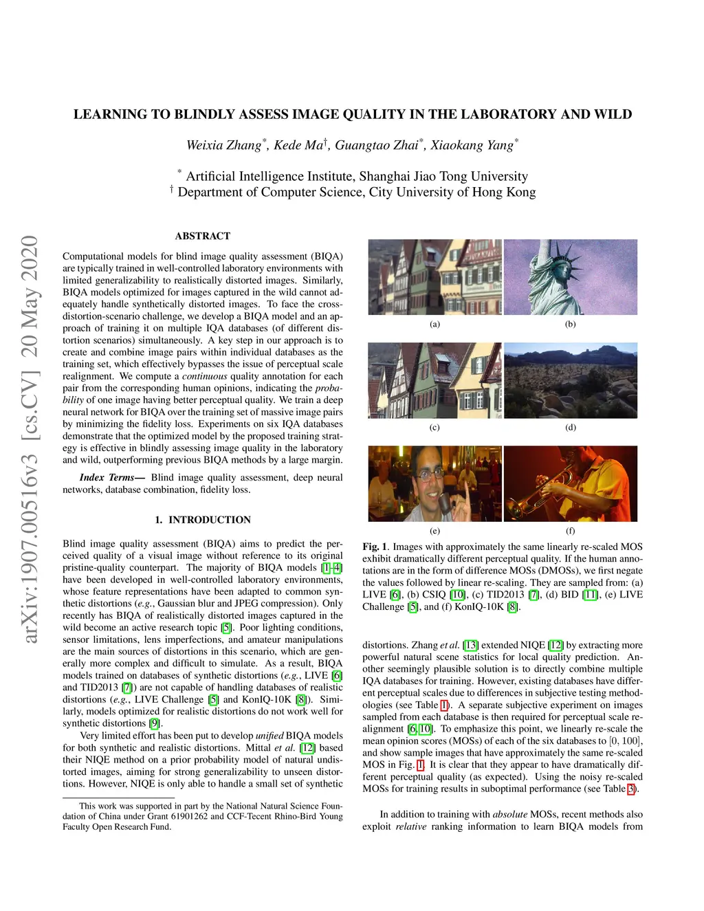 Computational models for blind image quality assessment (BIQA) are typically trained in well-controlled laboratory environments with limited generalizability to realistically distorted images. Similarly, BIQA models optimized for images captured in the wild cannot adequately handle synthetically distorted images. To face the cross-distortion-scenario challenge, we develop a BIQA model and an approach of training it on multiple IQA databases (of different distortion scenarios) simultaneously. A key step in our approach is to create and combine image pairs within individual databases as the training set, which effectively bypasses the issue of perceptual scale realignment. We compute a continuous quality annotation for each pair from the corresponding human opinions, indicating the probability of one image having better perceptual quality. We train a deep neural network for BIQA over the training set of massive image pairs by minimizing the fidelity loss. Experiments on six IQA databases demonstrate that the optimized model by the proposed training strategy is effective in blindly assessing image quality in the laboratory and wild, outperforming previous BIQA methods by a large margin.