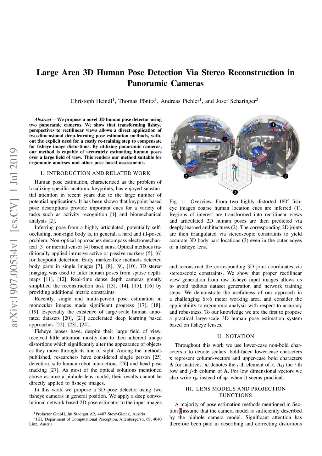 We propose a novel 3D human pose detector using two panoramic cameras. We show that transforming fisheye perspectives to rectilinear views allows a direct application of two-dimensional deep-learning pose estimation methods, without the explicit need for a costly re-training step to compensate for fisheye image distortions. By utilizing panoramic cameras, our method is capable of accurately estimating human poses over a large field of view. This renders our method suitable for ergonomic analyses and other pose based assessments.