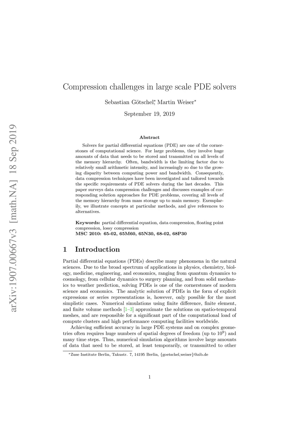 Solvers for partial differential equations (PDE) are one of the cornerstones of computational science. For large problems, they involve huge amounts of data that needs to be stored and transmitted on all levels of the memory hierarchy. Often, bandwidth is the limiting factor due to relatively small arithmetic intensity, and increasingly so due to the growing disparity between computing power and bandwidth. Consequently, data compression techniques have been investigated and tailored towards the specific requirements of PDE solvers during the last decades. This paper surveys data compression challenges and corresponding solution approaches for PDE problems, covering all levels of the memory hierarchy from mass storage up to main memory. Exemplarily, we illustrate concepts at particular methods, and give references to alternatives.