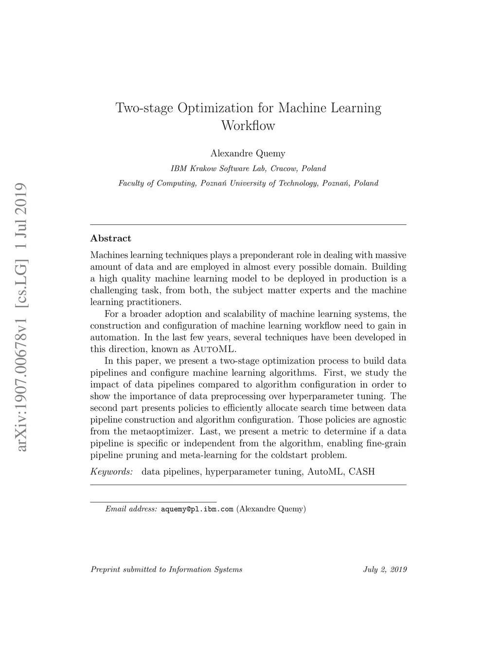 Machines learning techniques plays a preponderant role in dealing with massive amount of data and are employed in almost every possible domain. Building a high quality machine learning model to be deployed in production is a challenging task, from both, the subject matter experts and the machine learning practitioners. For a broader adoption and scalability of machine learning systems, the construction and configuration of machine learning workflow need to gain in automation. In the last few years, several techniques have been developed in this direction, known as autoML. In this paper, we present a two-stage optimization process to build data pipelines and configure machine learning algorithms. First, we study the impact of data pipelines compared to algorithm configuration in order to show the importance of data preprocessing over hyperparameter tuning. The second part presents policies to efficiently allocate search time between data pipeline construction and algorithm configuration. Those policies are agnostic from the metaoptimizer. Last, we present a metric to determine if a data pipeline is specific or independent from the algorithm, enabling fine-grain pipeline pruning and meta-learning for the coldstart problem.