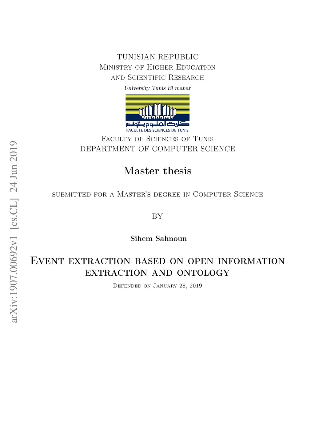 The work presented in this master thesis consists of extracting a set of events from texts written in natural language. For this purpose, we have based ourselves on the basic notions of the information extraction as well as the open information extraction. First, we applied an open information extraction(OIE) system for the relationship extraction, to highlight the importance of OIEs in event extraction, and we used the ontology to the event modeling. We tested the results of our approach with test metrics. As a result, the two-level event extraction approach has shown good performance results but requires a lot of expert intervention in the construction of classifiers and this will take time. In this context we have proposed an approach that reduces the expert intervention in the relation extraction, the recognition of entities and the reasoning which are automatic and based on techniques of adaptation and correspondence. Finally, to prove the relevance of the extracted results, we conducted a set of experiments using different test metrics as well as a comparative study.
