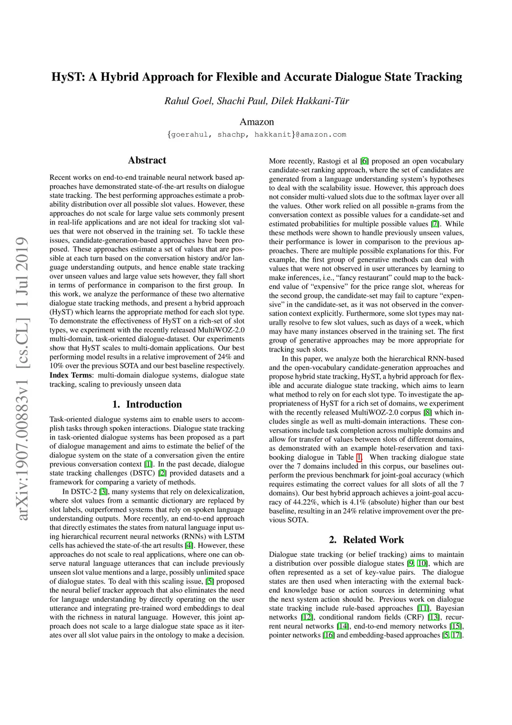 Recent works on end-to-end trainable neural network based approaches have demonstrated state-of-the-art results on dialogue state tracking. The best performing approaches estimate a probability distribution over all possible slot values. However, these approaches do not scale for large value sets commonly present in real-life applications and are not ideal for tracking slot values that were not observed in the training set. To tackle these issues, candidate-generation-based approaches have been proposed. These approaches estimate a set of values that are possible at each turn based on the conversation history and/or language understanding outputs, and hence enable state tracking over unseen values and large value sets however, they fall short in terms of performance in comparison to the first group. In this work, we analyze the performance of these two alternative dialogue state tracking methods, and present a hybrid approach (HyST) which learns the appropriate method for each slot type. To demonstrate the effectiveness of HyST on a rich-set of slot types, we experiment with the recently released MultiWOZ-2.0 multi-domain, task-oriented dialogue-dataset. Our experiments show that HyST scales to multi-domain applications. Our best performing model results in a relative improvement of 24% and 10% over the previous SOTA and our best baseline respectively.