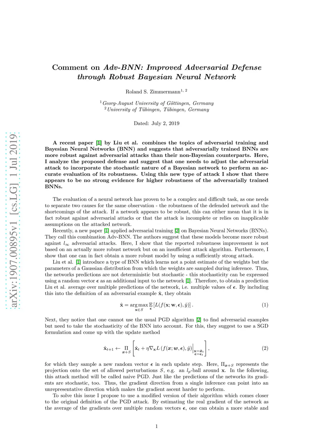 A recent paper by Liu et al. combines the topics of adversarial training and Bayesian Neural Networks (BNN) and suggests that adversarially trained BNNs are more robust against adversarial attacks than their non-Bayesian counterparts. Here, I analyze the proposed defense and suggest that one needs to adjust the adversarial attack to incorporate the stochastic nature of a Bayesian network to perform an accurate evaluation of its robustness. Using this new type of attack I show that there appears to be no strong evidence for higher robustness of the adversarially trained BNNs.