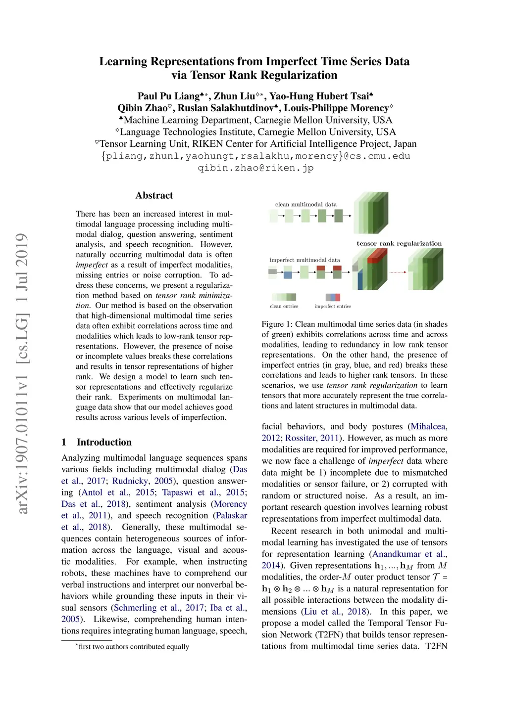 There has been an increased interest in multimodal language processing including multimodal dialog, question answering, sentiment analysis, and speech recognition. However, naturally occurring multimodal data is often imperfect as a result of imperfect modalities, missing entries or noise corruption. To address these concerns, we present a regularization method based on tensor rank minimization. Our method is based on the observation that high-dimensional multimodal time series data often exhibit correlations across time and modalities which leads to low-rank tensor representations. However, the presence of noise or incomplete values breaks these correlations and results in tensor representations of higher rank. We design a model to learn such tensor representations and effectively regularize their rank. Experiments on multimodal language data show that our model achieves good results across various levels of imperfection.