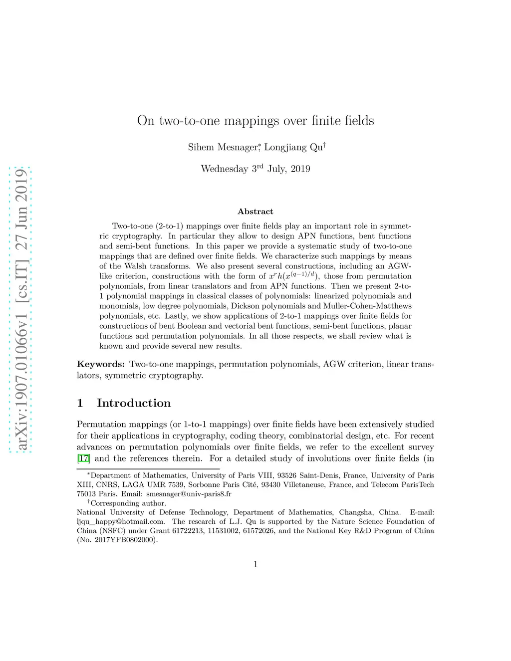 Two-to-one (-to-) mappings over finite fields play an important role in symmetric cryptography. In particular they allow to design APN functions, bent functions and semi-bent functions. In this paper we provide a systematic study of two-to-one mappings that are defined over finite fields. We characterize such mappings by means of the Walsh transforms. We also present several constructions, including an AGW-like criterion, constructions with the form of , those from permutation polynomials, from linear translators and from APN functions. Then we present -to- polynomial mappings in classical classes of polynomials: linearized polynomials and monomials, low degree polynomials, Dickson polynomials and Muller-Cohen-Matthews polynomials, etc. Lastly, we show applications of -to- mappings over finite fields for constructions of bent Boolean and vectorial bent functions, semi-bent functions, planar functions and permutation polynomials. In all those respects, we shall review what is known and provide several new results.
