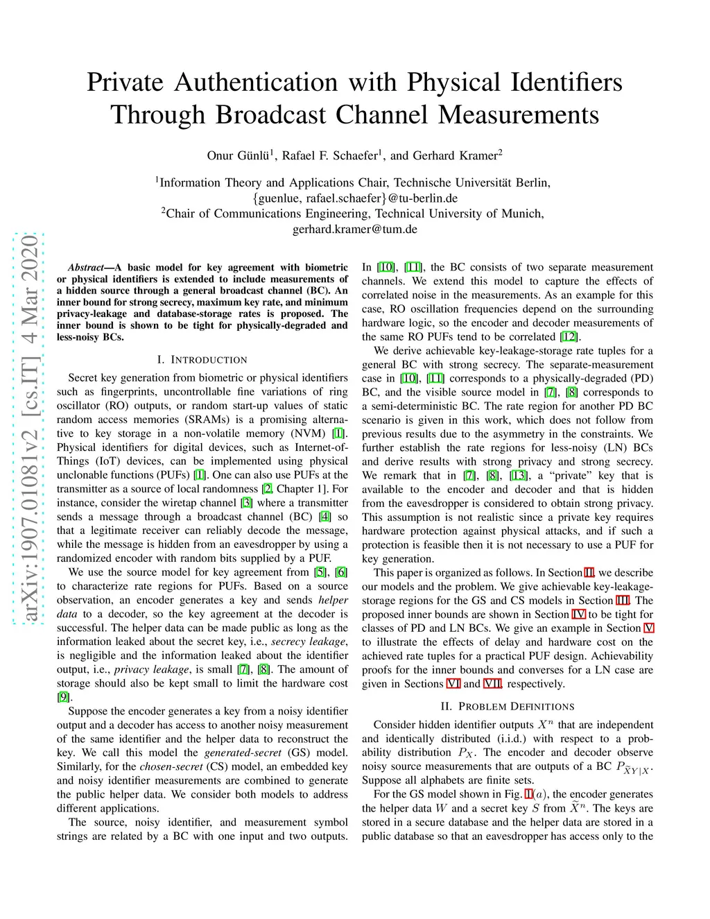 A basic model for key agreement with biometric or physical identifiers is extended to include measurements of a hidden source through a general broadcast channel (BC). An inner bound for strong secrecy, maximum key rate, and minimum privacy-leakage and database-storage rates is proposed. The inner bound is shown to be tight for physically-degraded and less-noisy BCs.