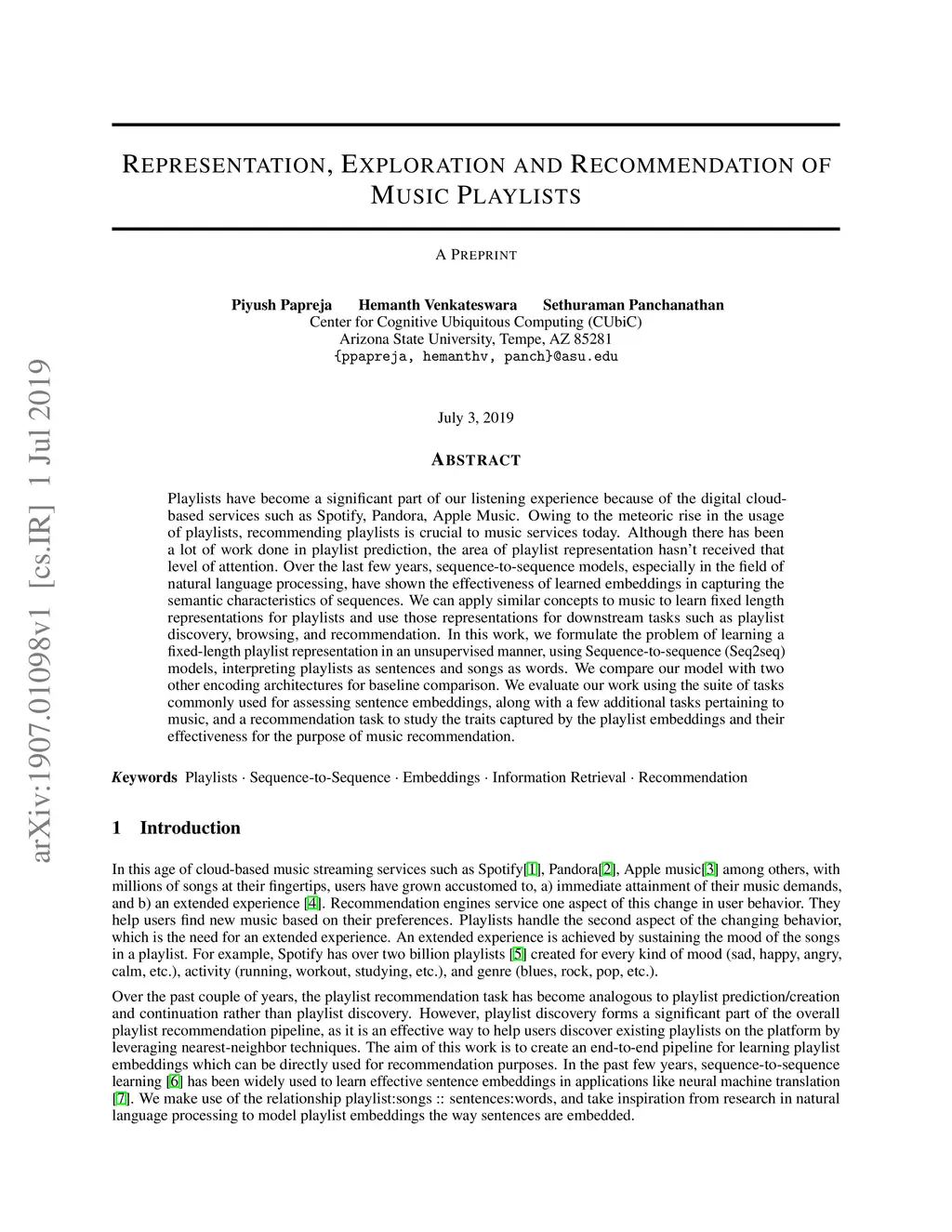 Representation, Exploration and Recommendation of Music Playlists