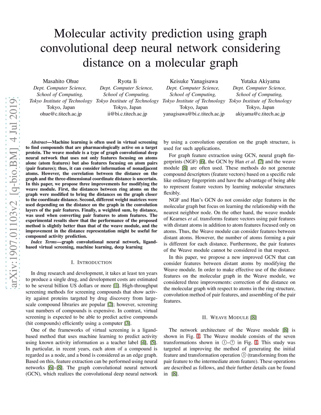 Machine learning is often used in virtual screening to find compounds that are pharmacologically active on a target protein. The weave module is a type of graph convolutional deep neural network that uses not only features focusing on atoms alone (atom features) but also features focusing on atom pairs (pair features); thus, it can consider information of nonadjacent atoms. However, the correlation between the distance on the graph and the three-dimensional coordinate distance is uncertain. In this paper, we propose three improvements for modifying the weave module. First, the distances between ring atoms on the graph were modified to bring the distances on the graph closer to the coordinate distance. Second, different weight matrices were used depending on the distance on the graph in the convolution layers of the pair features. Finally, a weighted sum, by distance, was used when converting pair features to atom features. The experimental results show that the performance of the proposed method is slightly better than that of the weave module, and the improvement in the distance representation might be useful for compound activity prediction.