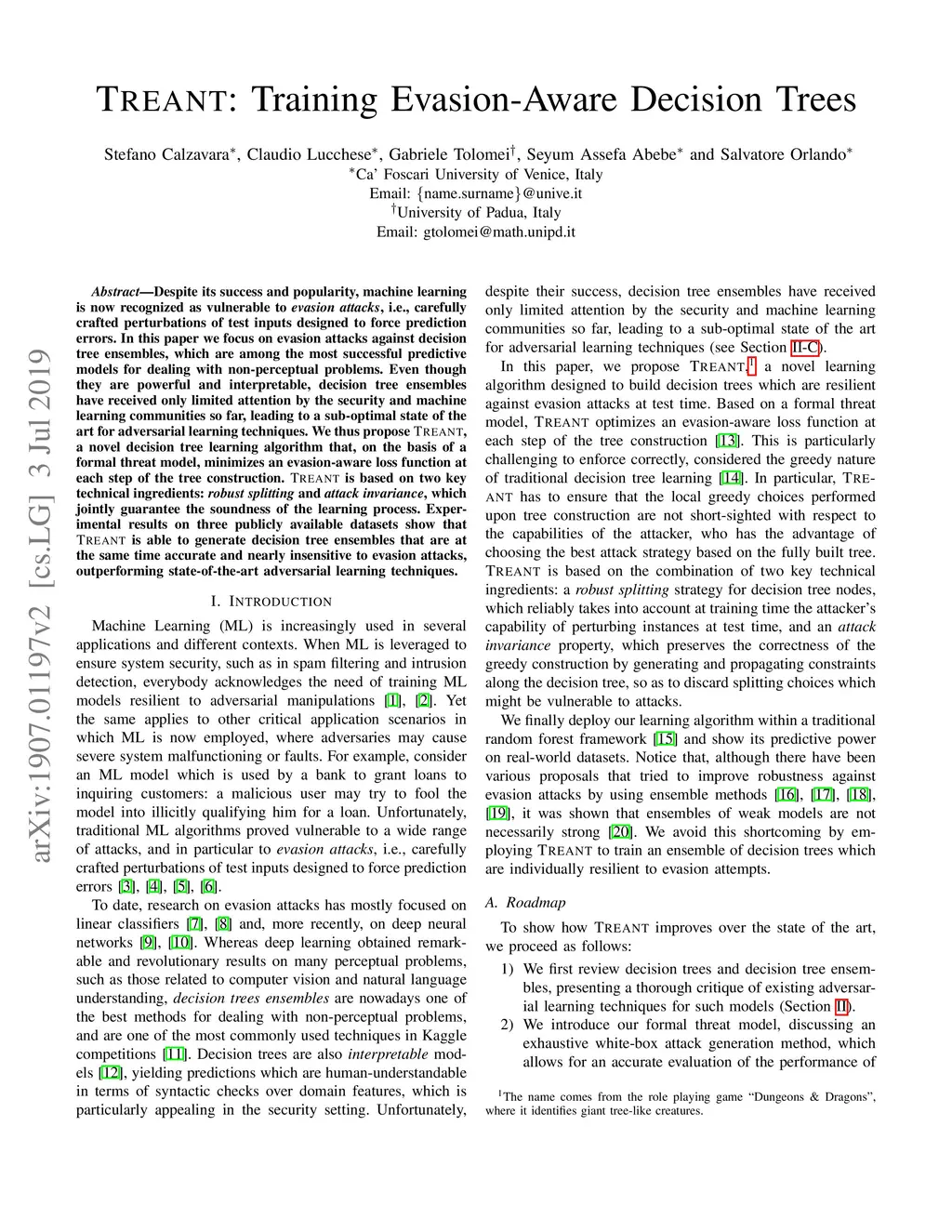 Despite its success and popularity, machine learning is now recognized as vulnerable to evasion attacks, i.e., carefully crafted perturbations of test inputs designed to force prediction errors. In this paper we focus on evasion attacks against decision tree ensembles, which are among the most successful predictive models for dealing with non-perceptual problems. Even though they are powerful and interpretable, decision tree ensembles have received only limited attention by the security and machine learning communities so far, leading to a sub-optimal state of the art for adversarial learning techniques. We thus propose Treant, a novel decision tree learning algorithm that, on the basis of a formal threat model, minimizes an evasion-aware loss function at each step of the tree construction. Treant is based on two key technical ingredients: robust splitting and attack invariance, which jointly guarantee the soundness of the learning process. Experimental results on three publicly available datasets show that Treant is able to generate decision tree ensembles that are at the same time accurate and nearly insensitive to evasion attacks, outperforming state-of-the-art adversarial learning techniques.