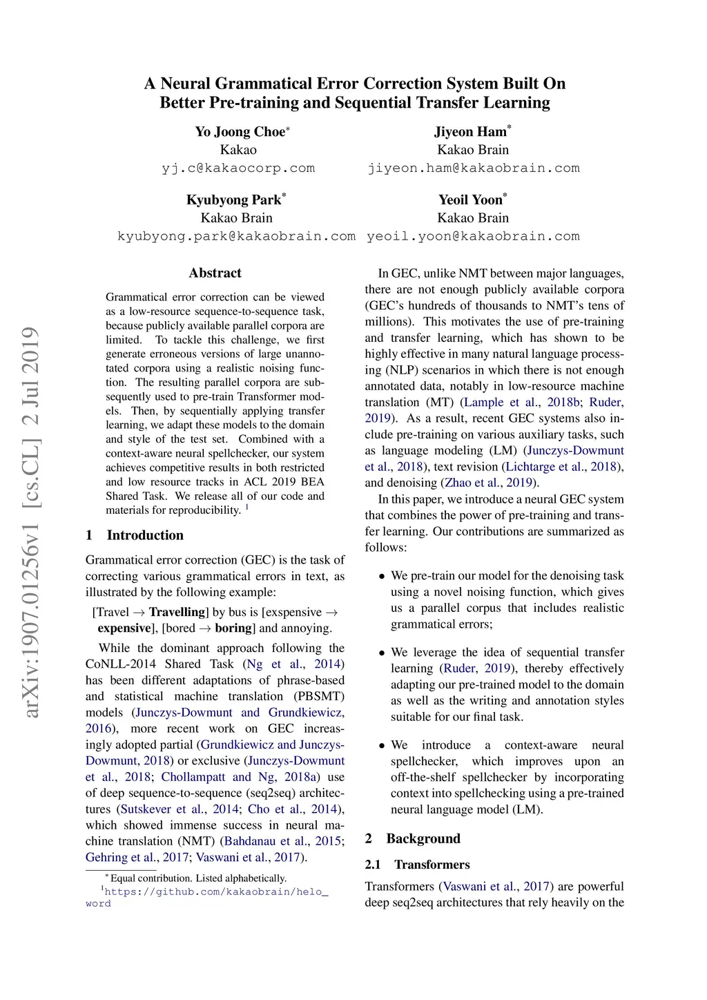 Grammatical error correction can be viewed as a low-resource sequence-to-sequence task, because publicly available parallel corpora are limited. To tackle this challenge, we first generate erroneous versions of large unannotated corpora using a realistic noising function. The resulting parallel corpora are subsequently used to pre-train Transformer models. Then, by sequentially applying transfer learning, we adapt these models to the domain and style of the test set. Combined with a context-aware neural spellchecker, our system achieves competitive results in both restricted and low resource tracks in ACL 2019 BEA Shared Task. We release all of our code and materials for reproducibility.