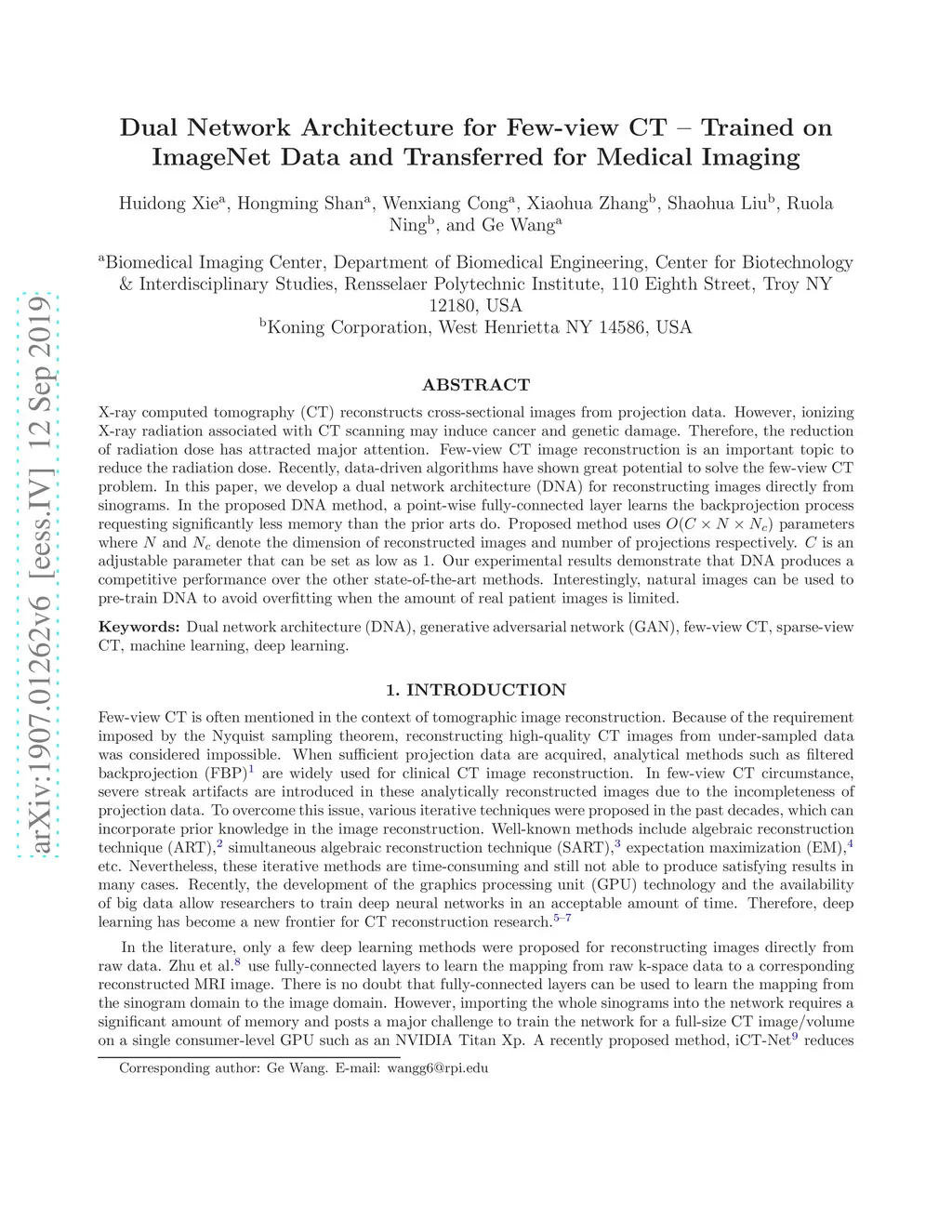 Dual Network Architecture for Few-view CT -- Trained on ImageNet Data