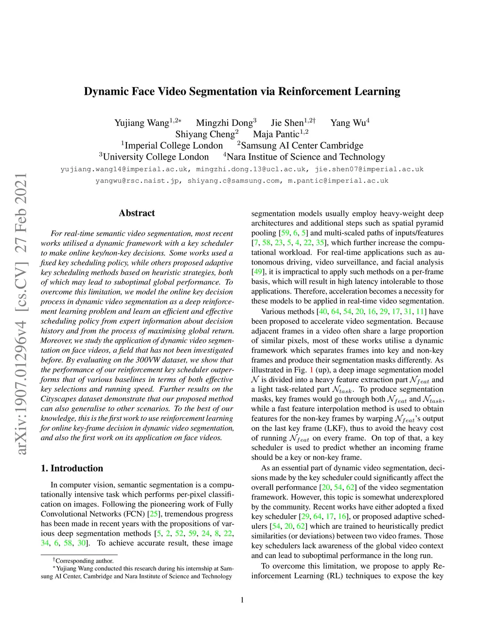 Dynamic Face Video Segmentation via Reinforcement Learning