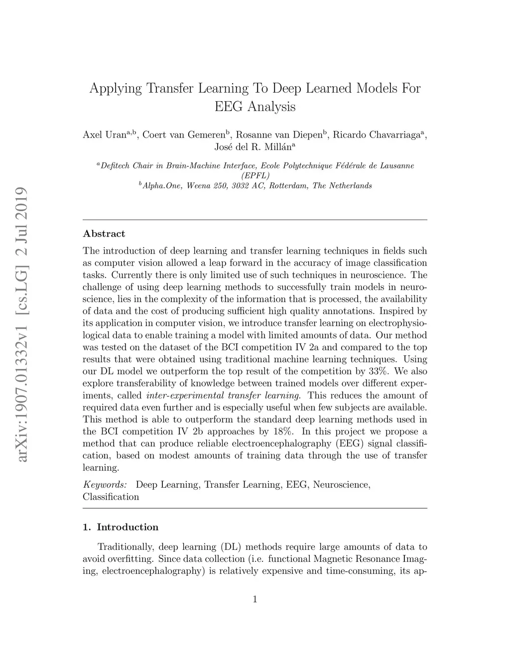 The introduction of deep learning and transfer learning techniques in fields such as computer vision allowed a leap forward in the accuracy of image classification tasks. Currently there is only limited use of such techniques in neuroscience. The challenge of using deep learning methods to successfully train models in neuroscience, lies in the complexity of the information that is processed, the availability of data and the cost of producing sufficient high quality annotations. Inspired by its application in computer vision, we introduce transfer learning on electrophysiological data to enable training a model with limited amounts of data. Our method was tested on the dataset of the BCI competition IV 2a and compared to the top results that were obtained using traditional machine learning techniques. Using our DL model we outperform the top result of the competition by 33%. We also explore transferability of knowledge between trained models over different experiments, called inter-experimental transfer learning. This reduces the amount of required data even further and is especially useful when few subjects are available. This method is able to outperform the standard deep learning methods used in the BCI competition IV 2b approaches by 18%. In this project we propose a method that can produce reliable electroencephalography (EEG) signal classification, based on modest amounts of training data through the use of transfer learning.