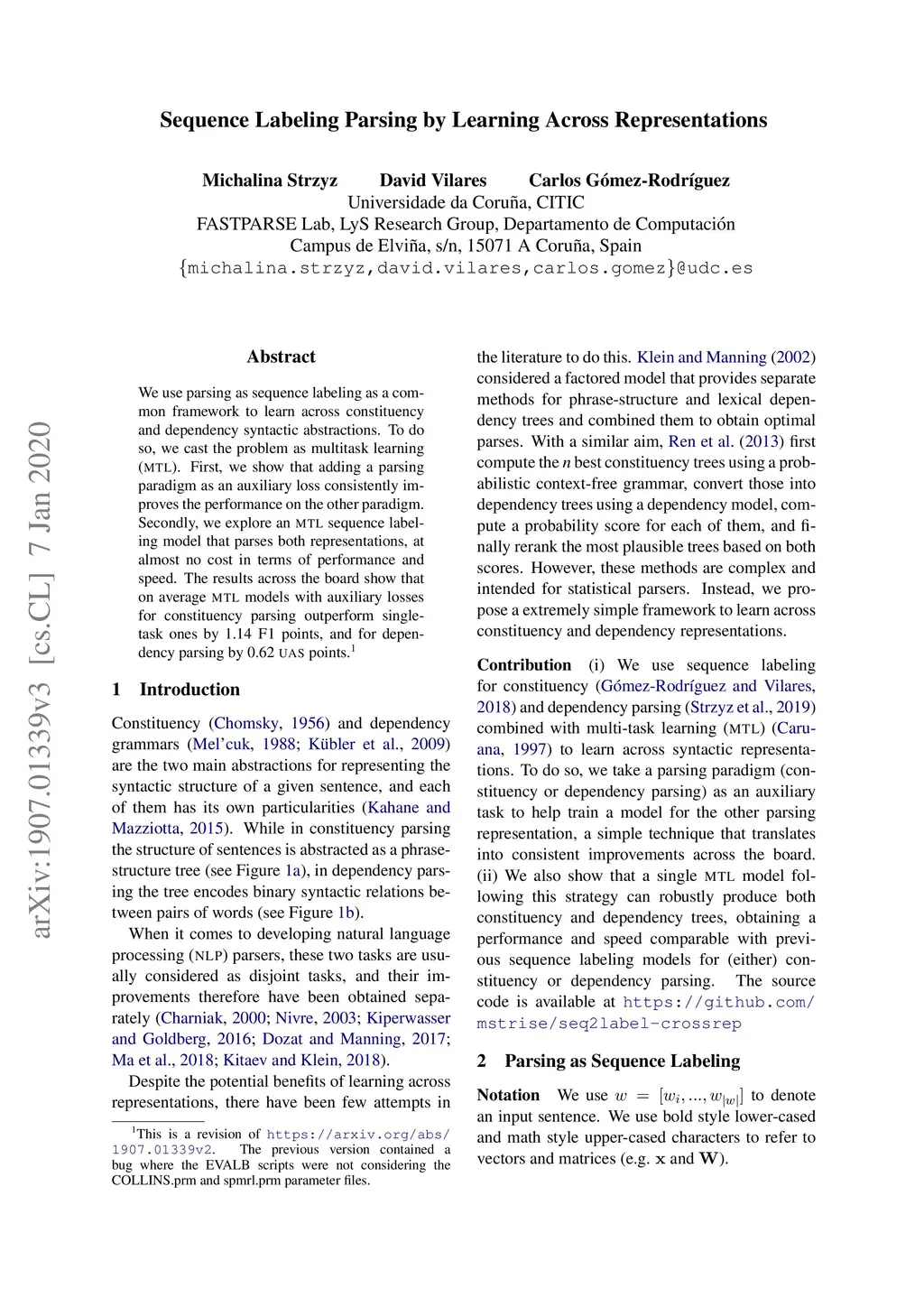 We use parsing as sequence labeling as a common framework to learn across constituency and dependency syntactic abstractions. To do so, we cast the problem as multitask learning (MTL). First, we show that adding a parsing paradigm as an auxiliary loss consistently improves the performance on the other paradigm. Secondly, we explore an MTL sequence labeling model that parses both representations, at almost no cost in terms of performance and speed. The results across the board show that on average MTL models with auxiliary losses for constituency parsing outperform single-task ones by 1.14 F1 points, and for dependency parsing by 0.62 UAS points.