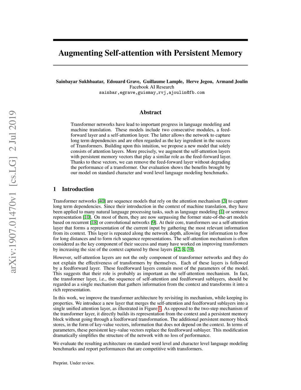 Transformer networks have lead to important progress in language modeling and machine translation. These models include two consecutive modules, a feed-forward layer and a self-attention layer. The latter allows the network to capture long term dependencies and are often regarded as the key ingredient in the success of Transformers. Building upon this intuition, we propose a new model that solely consists of attention layers. More precisely, we augment the self-attention layers with persistent memory vectors that play a similar role as the feed-forward layer. Thanks to these vectors, we can remove the feed-forward layer without degrading the performance of a transformer. Our evaluation shows the benefits brought by our model on standard character and word level language modeling benchmarks.