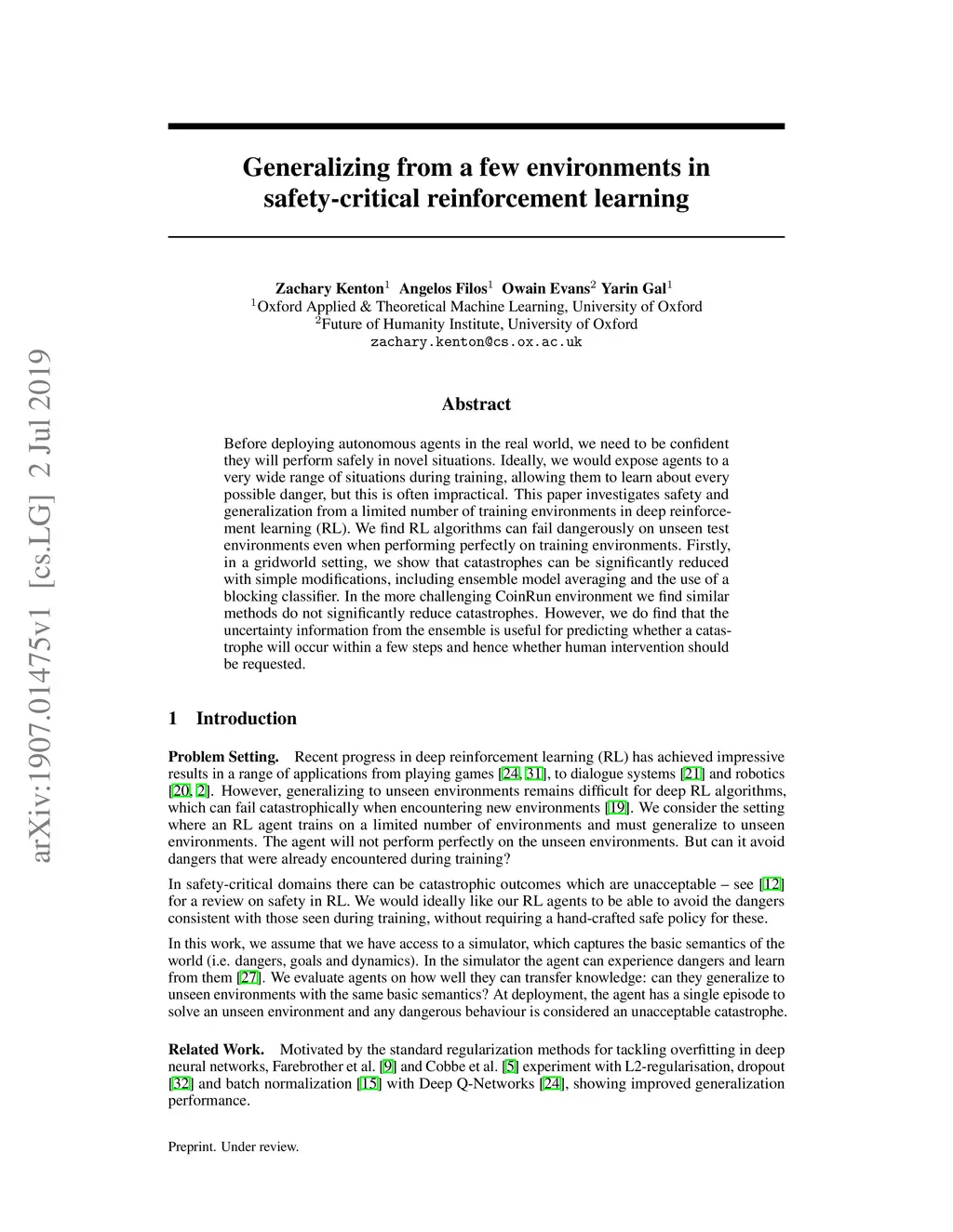 Before deploying autonomous agents in the real world, we need to be confident they will perform safely in novel situations. Ideally, we would expose agents to a very wide range of situations during training, allowing them to learn about every possible danger, but this is often impractical. This paper investigates safety and generalization from a limited number of training environments in deep reinforcement learning (RL). We find RL algorithms can fail dangerously on unseen test environments even when performing perfectly on training environments. Firstly, in a gridworld setting, we show that catastrophes can be significantly reduced with simple modifications, including ensemble model averaging and the use of a blocking classifier. In the more challenging CoinRun environment we find similar methods do not significantly reduce catastrophes. However, we do find that the uncertainty information from the ensemble is useful for predicting whether a catastrophe will occur within a few steps and hence whether human intervention should be requested.